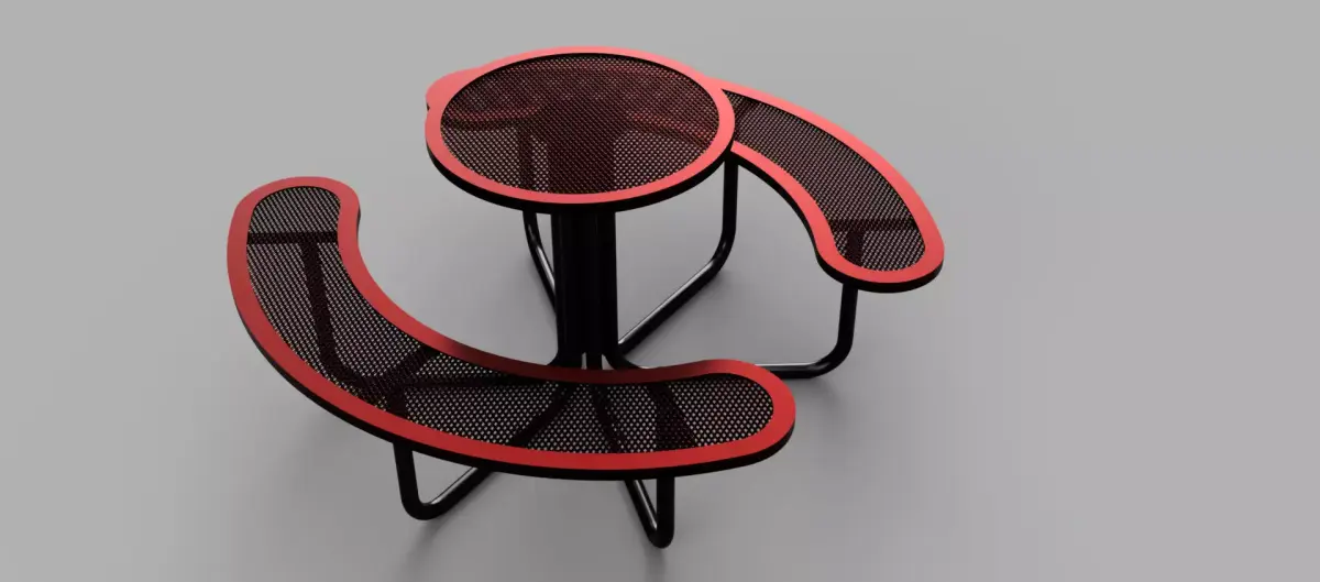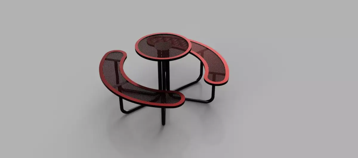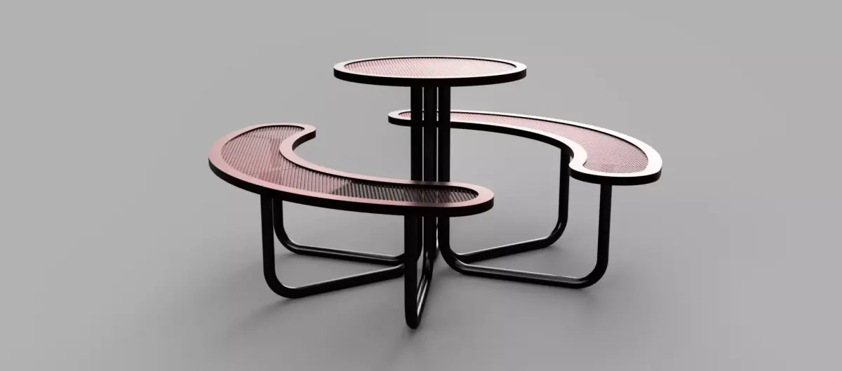 This model features a modern urban seating concept with perforated metal surfaces and smooth organic forms, making it ideal for public spaces and outdoor environments.