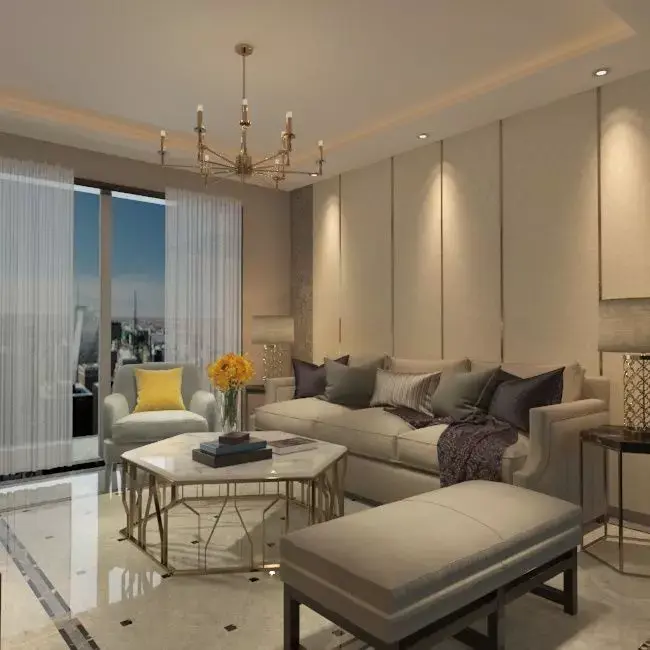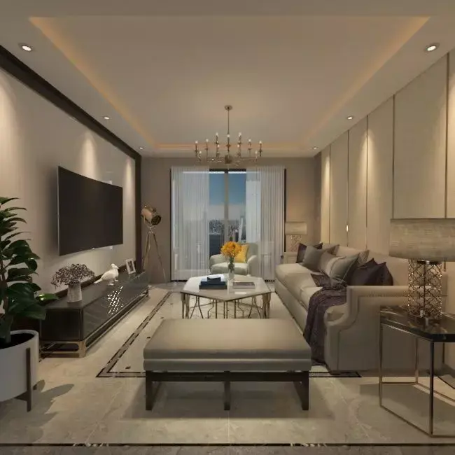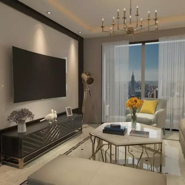 This image showcases a contemporary drawing room with a sophisticated and luxurious feel. The room features a neutral color palette with hints of gold and dark wood accents. A large, curved-screen television is mounted on a feature wall, which is illuminated by recessed lighting. A tall, leafy plant in a simple white pot adds a touch of nature, while a classic chandelier hangs from the ceiling, providing a focal point and ambient lighting. The window is adorned with sheer curtains, allowing natural light to filter in.