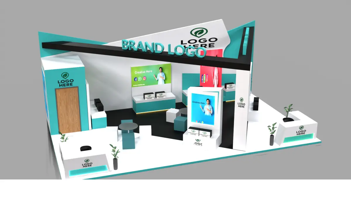 Key Features:Elegant teal and white theme with black accent framingBrand-focused layout with multiple product display zonesLED-lit reception counters to attract visitorsPromotional creative walls with high-impact image texturesDual lounge areas with table seating for interactionsVertical signage pillars and planter decor elements