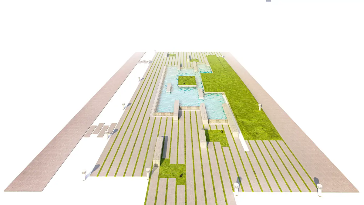 This is a high-detail, modular 3D model of a contemporary urban plaza or park landscape. The design features a multi-level layout with a prominent geometric water feature, expansive paved areas, and strips of integrated greenery/grass.