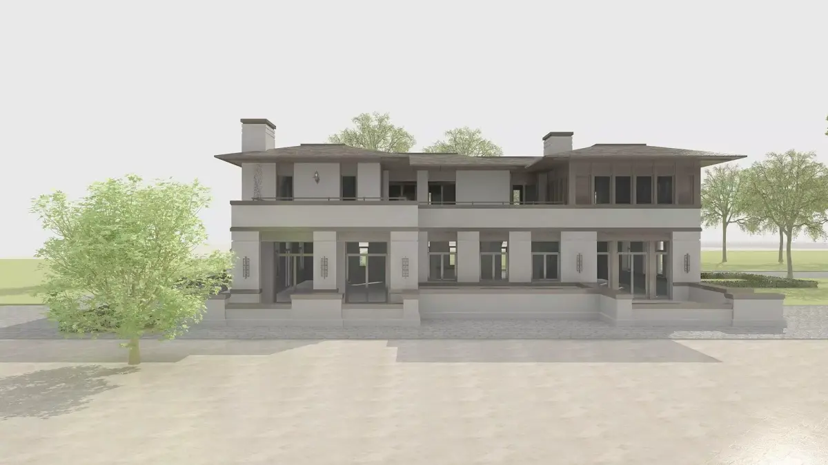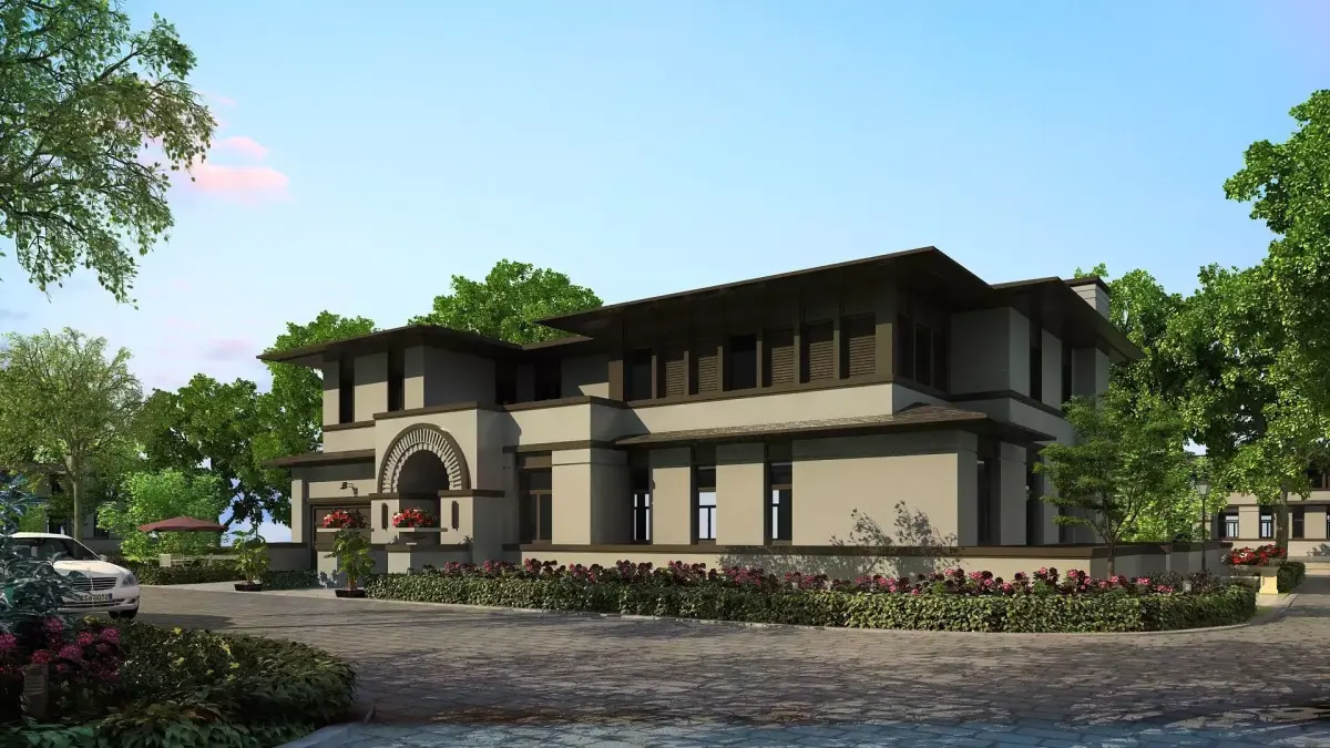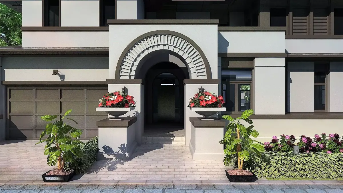 Exterior scene of a contemporary two storey House with a garage, outdoor lanterns, various plants.The plants are vrmesh-generated(11 vrmesh files).