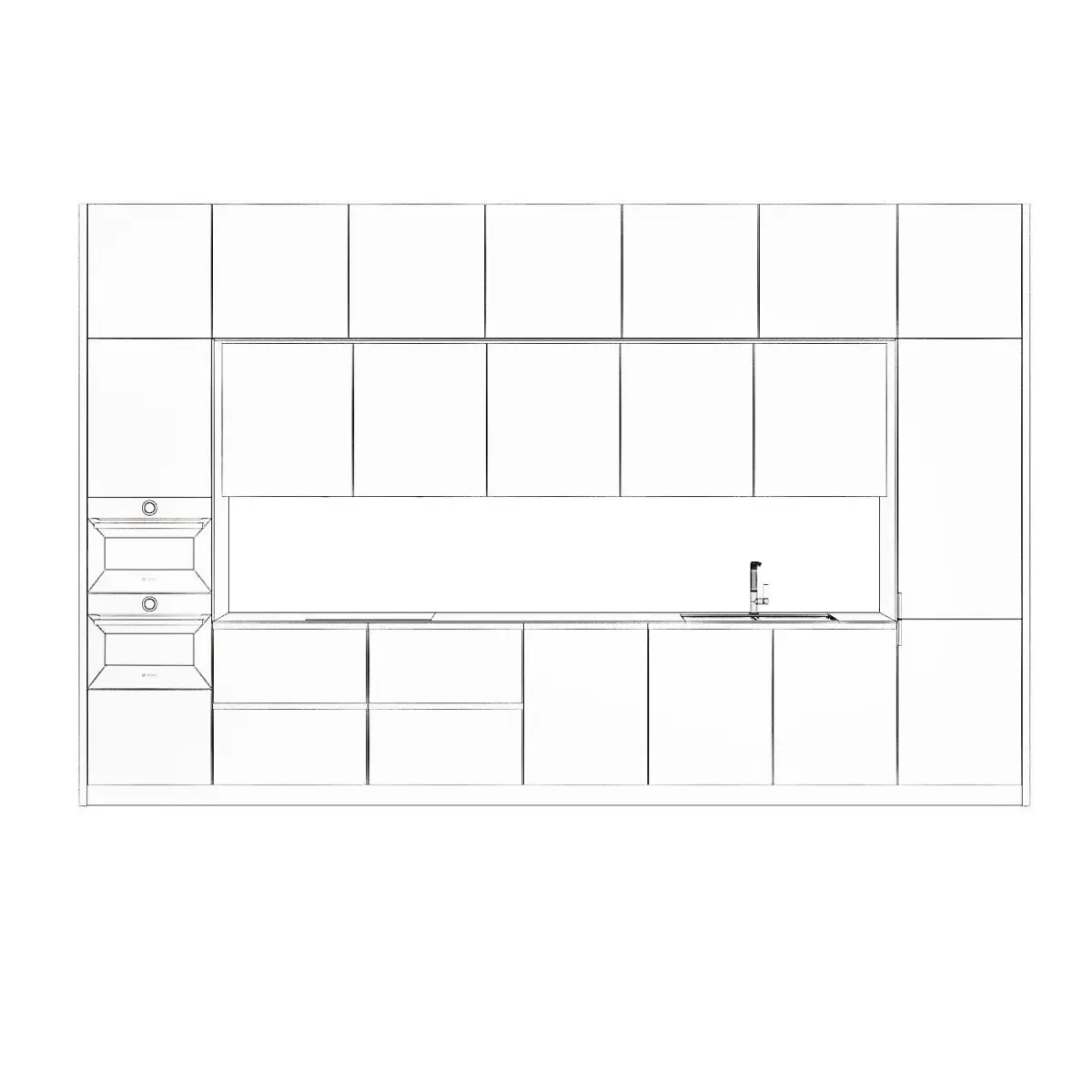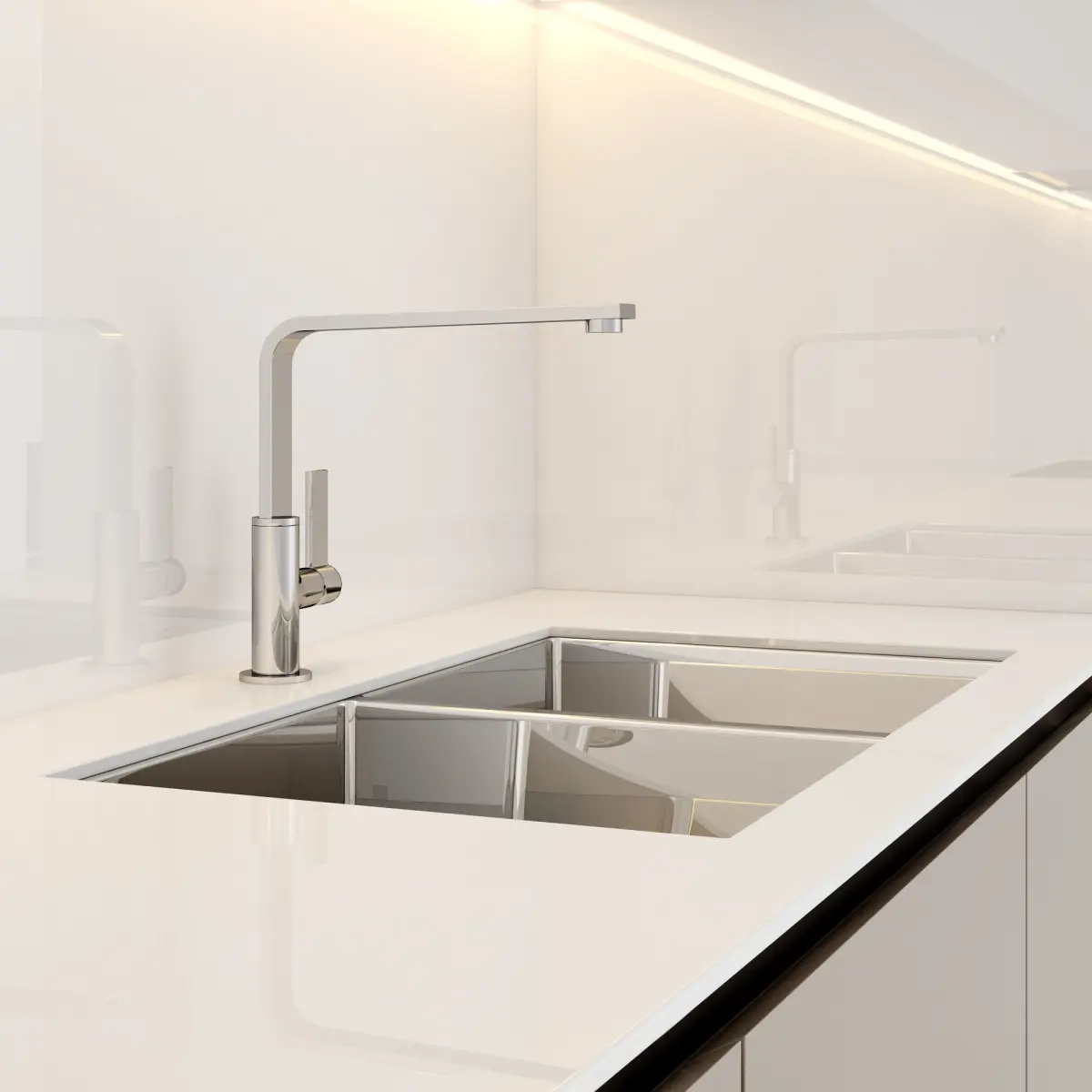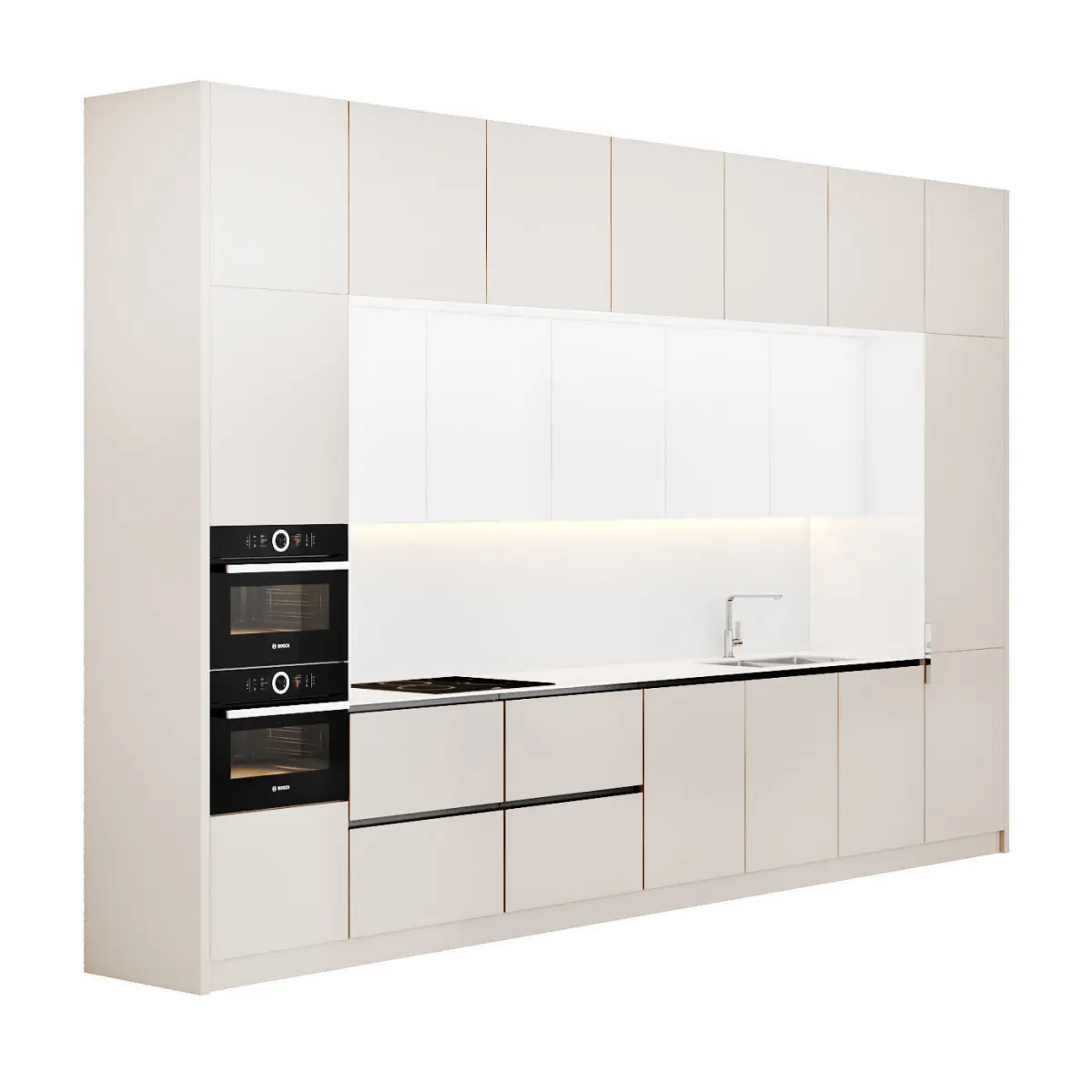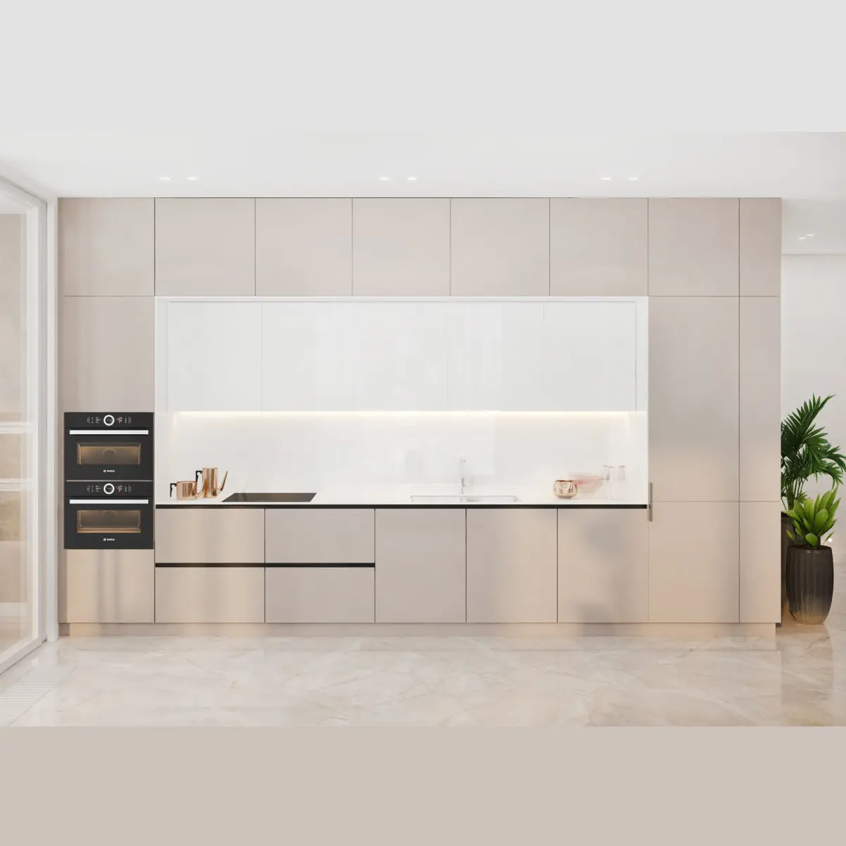 LED line light.White glossy laquer worktop and backsplash. Beige and white matte kitchen cabinets.