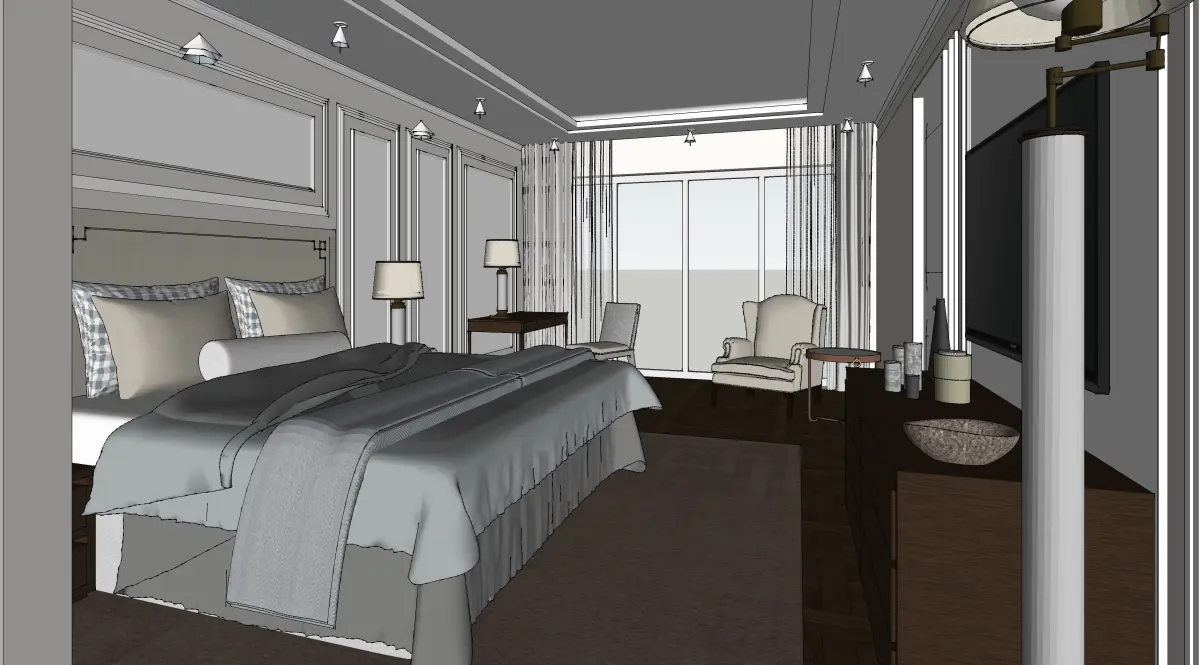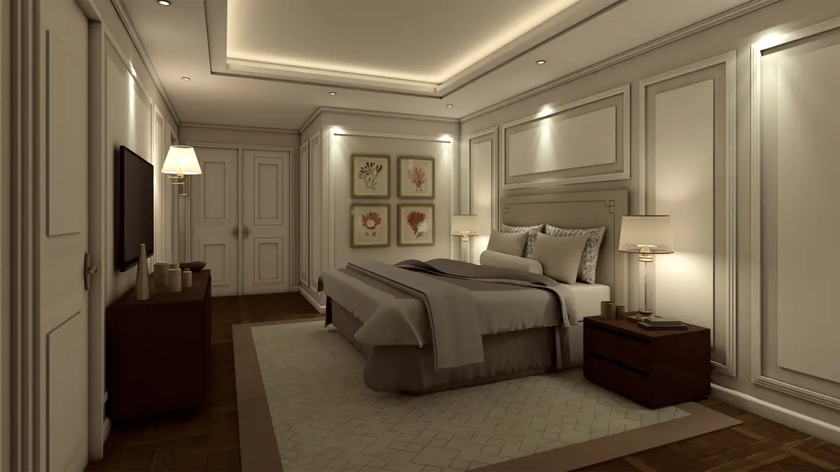 Contemporary Luxury Villa Bedroom Interior with unique design. Modern, highly detailed model with lot of 3D furniture models. Lightning, armchair, rug, night tables and commode are Eichholtz design models. Bedroom model is suitable for all site areas. The scene is made for the evening visopt. Model is done with sketch up and rendered with v-ray so all textures appliances and furniture equipment is in high resolution. Textures are compressed in zip file.