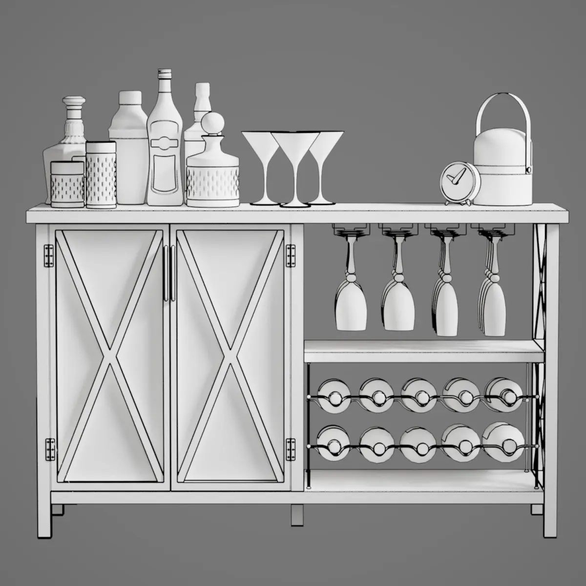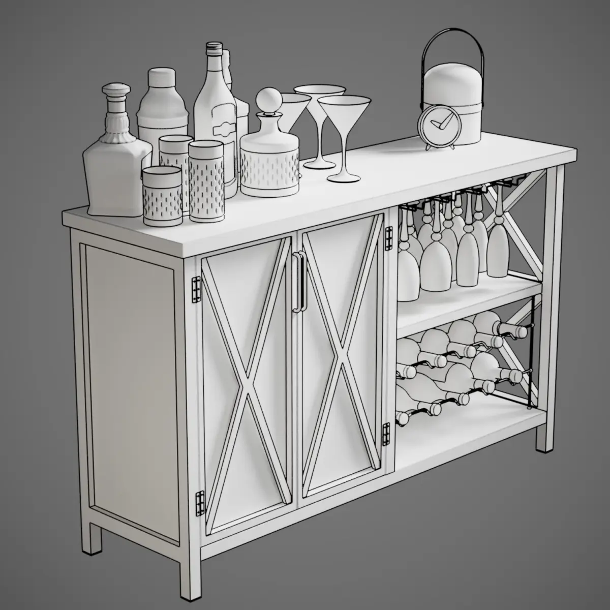 Contemporary mini bar cabinet model with PBR veneers, modeled together with accessories that can be used in the design of living spaces.
