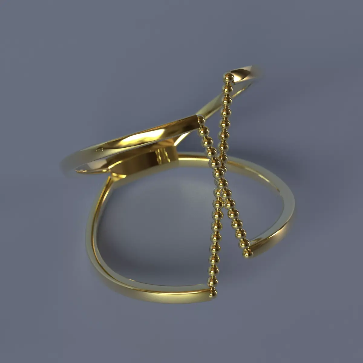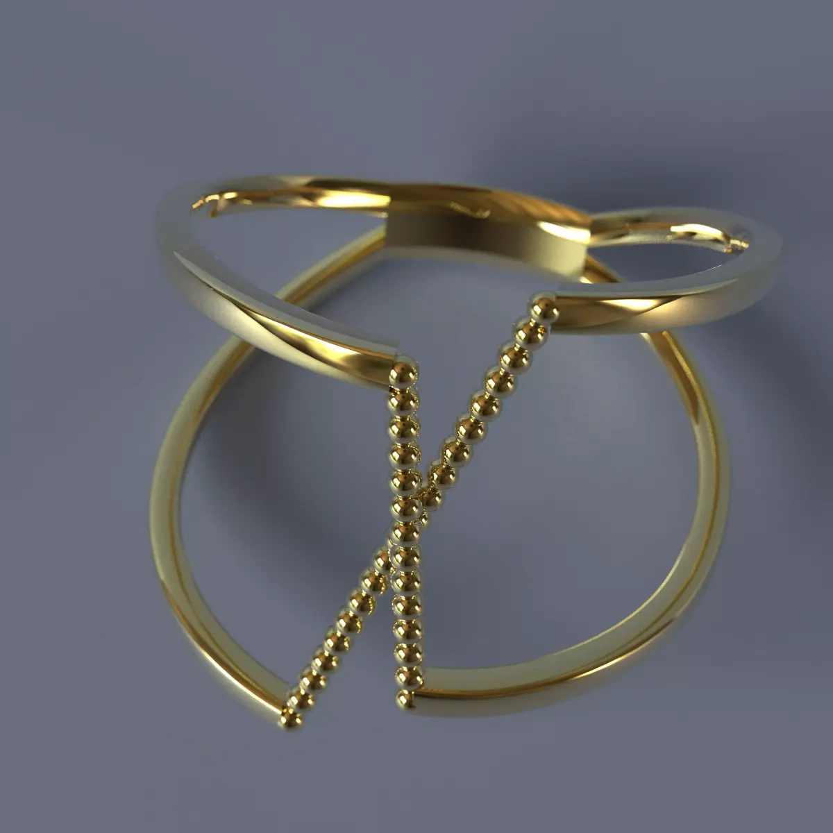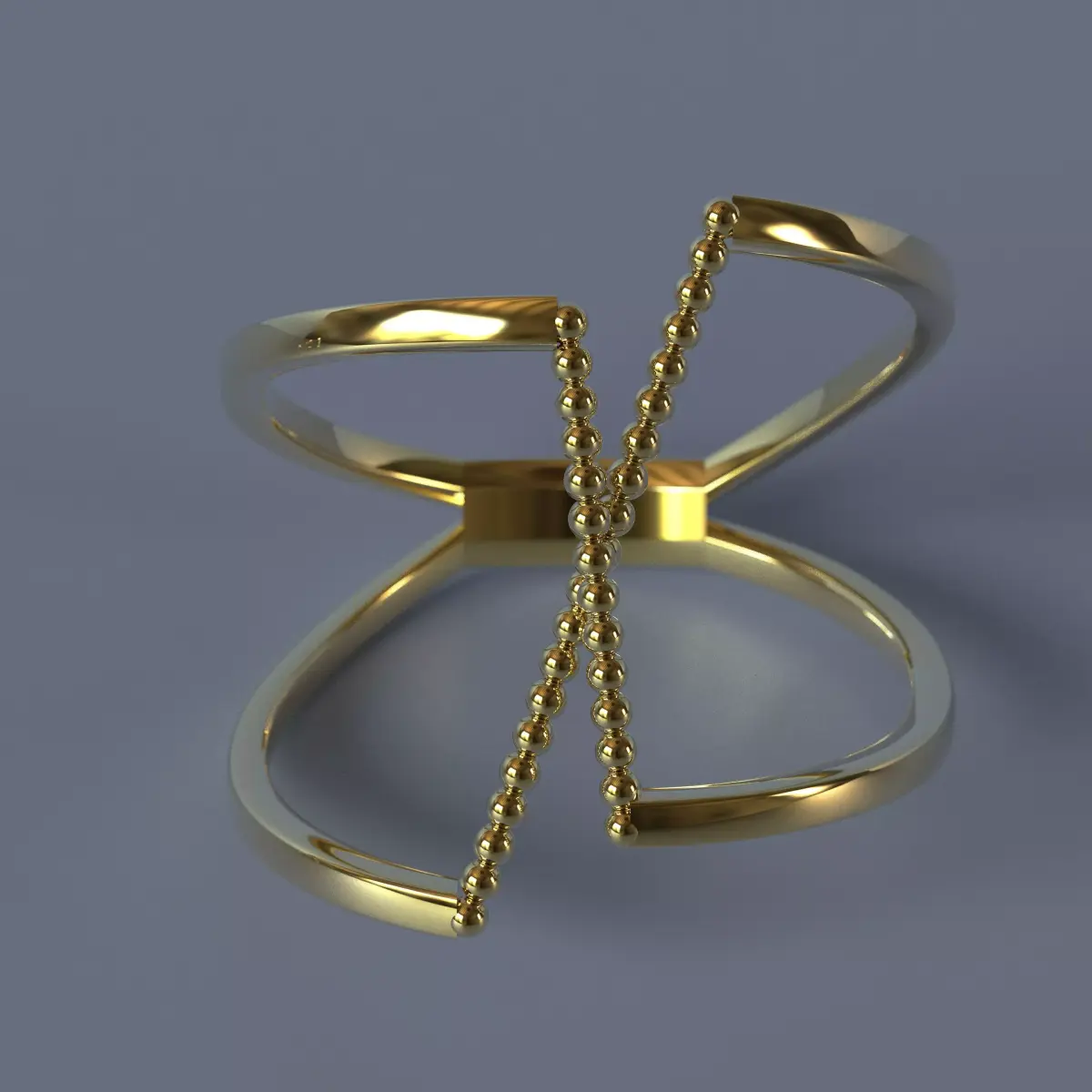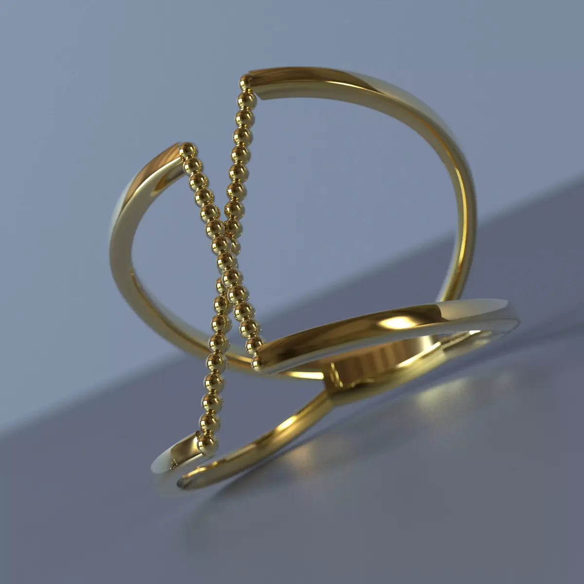 Each ring is formed by two open, polished bands representing structure, stability, and architectural order.Between them, a central beaded spine introduces rhythm and movement, acting as an organic connector between the two opposing sides.