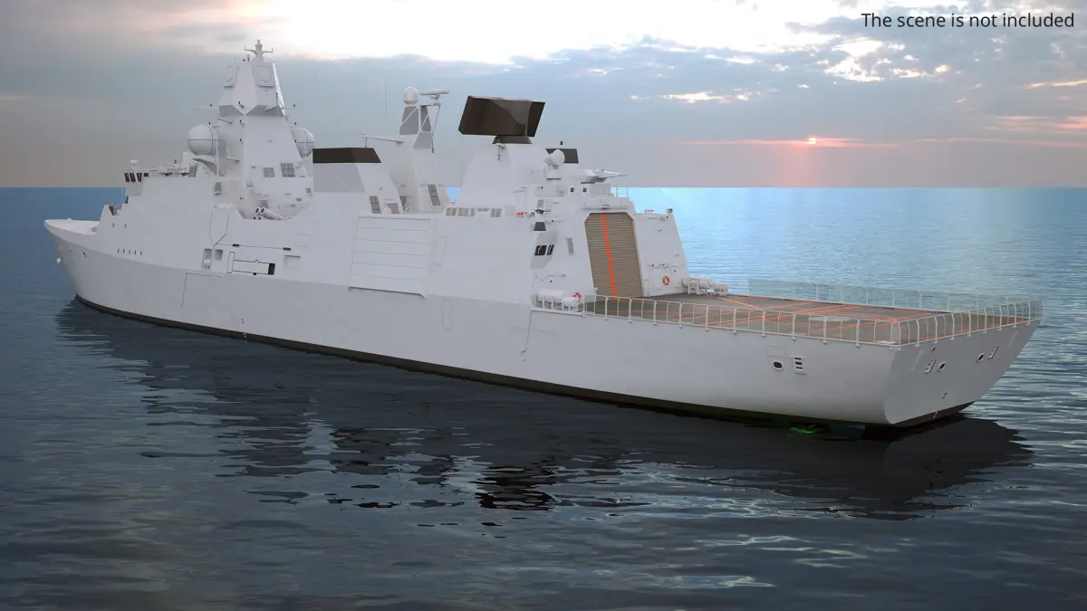 Contemporary Navy Frigate with Radar Systems White is a 3d model of an advanced naval vessel, used primarily for combat and patrol purposes on high seas.