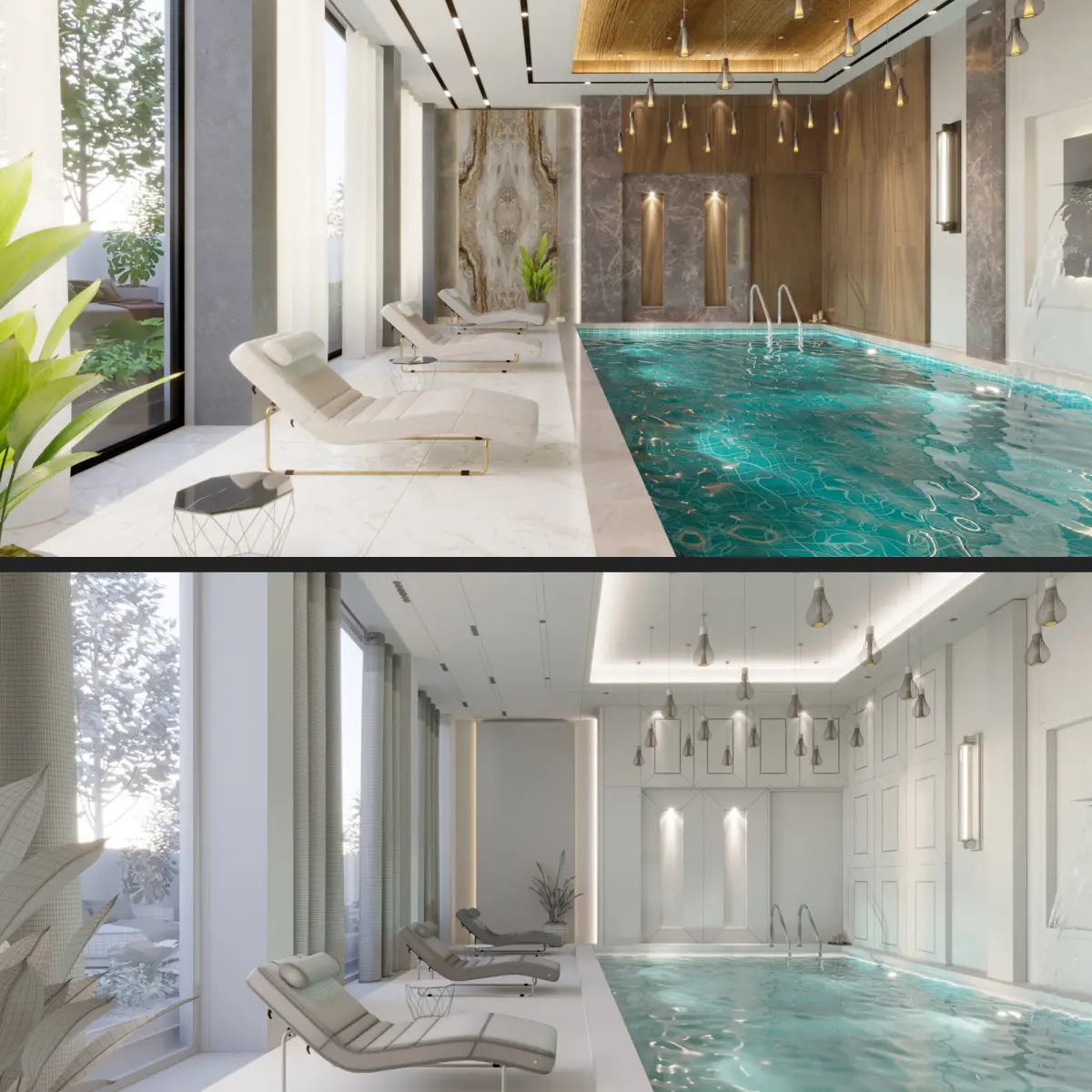 -Spaces present in this scene; Full detailed SPA Pool with various models. Full detailed Turkish bath interior with various models.