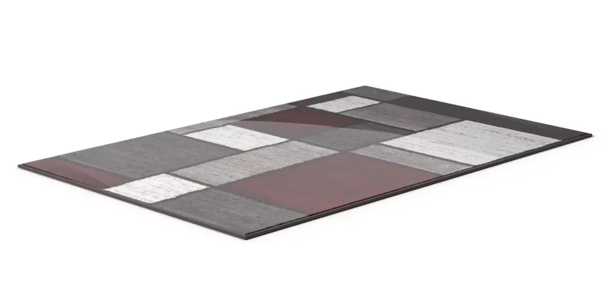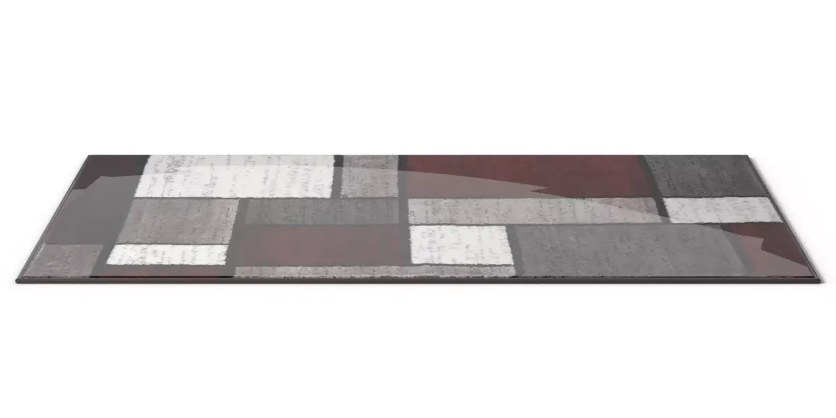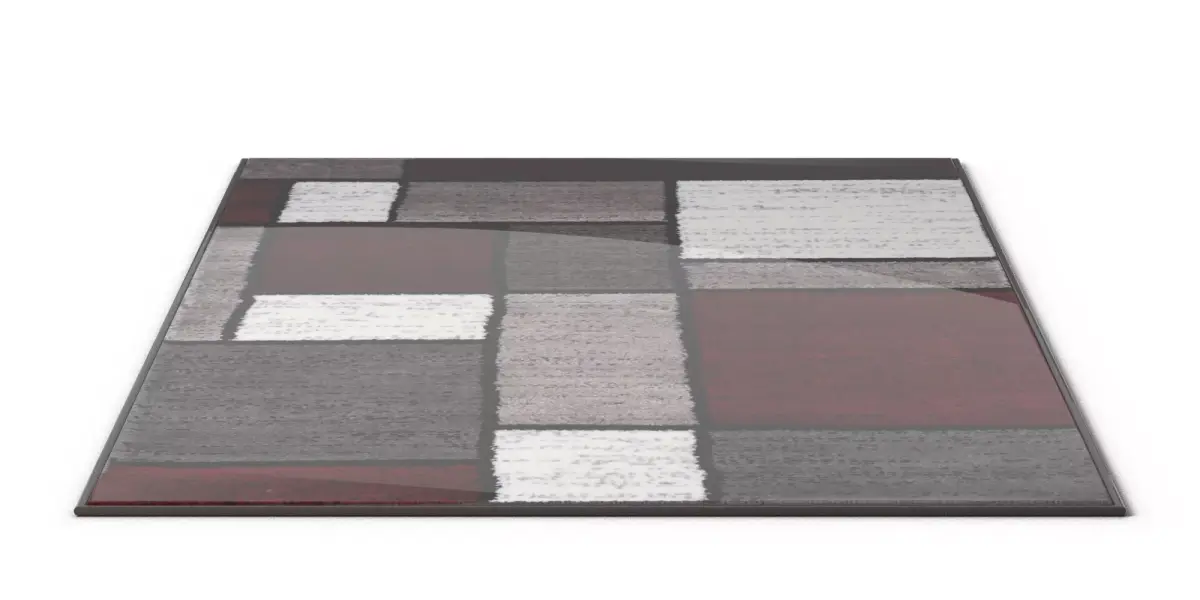 The Urbane Grid Area Rug A sophisticated blend of geometric precision and industrial textures. This piece features a bold color-blocking strategy using deep burgundy accents against a balanced palette of slate and charcoal grays. The distressed, stippled texture within the blocks adds visual depth and a soft, organic feel to the rigid rectangular layout. Perfect for modern living rooms or minimalist office spaces.