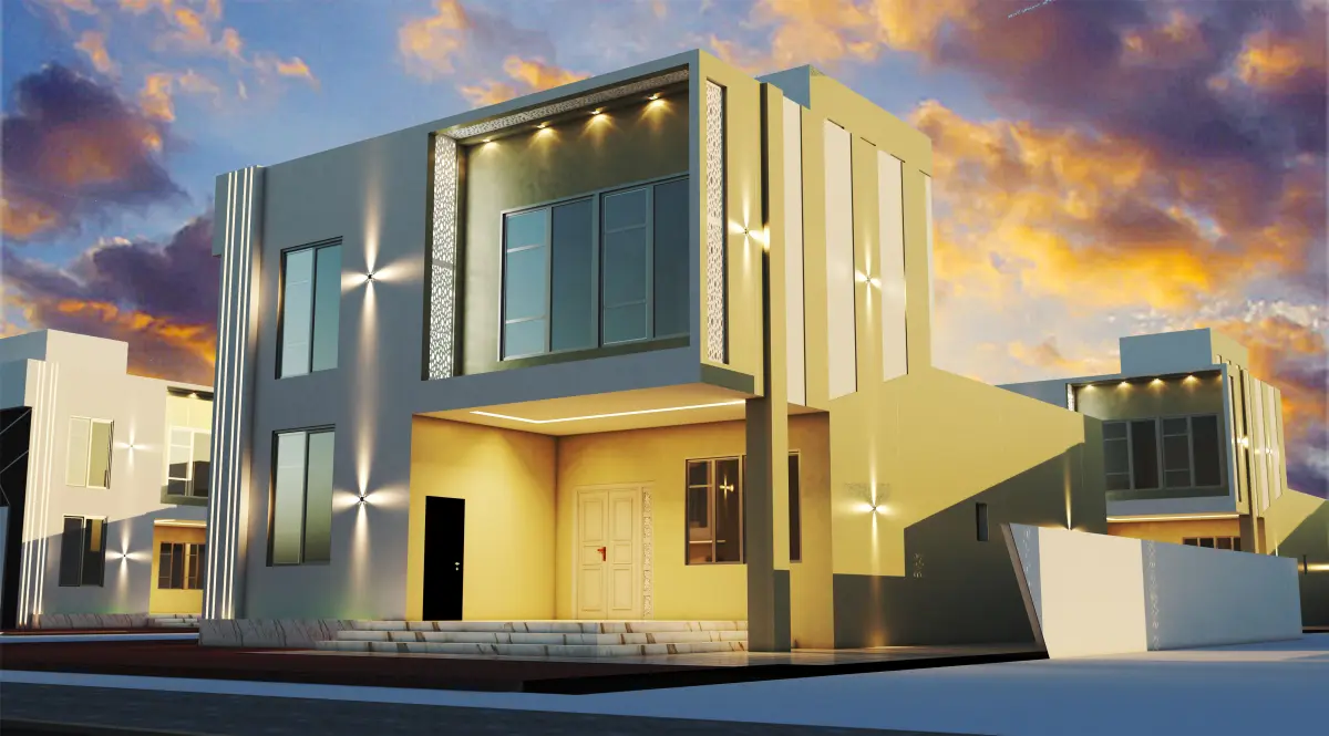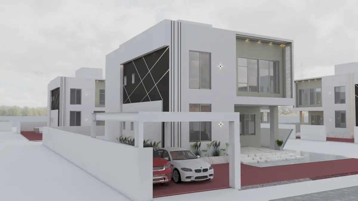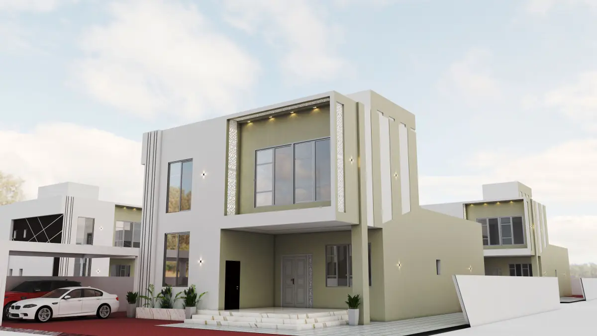 Modern two-story villa design with a minimalist facade, clean lines, and large windows. This architectural bundle includes detailed DWG plans, a SketchUp model, and high-quality 3D renders. Ideal for residential design proposals and client presentations.