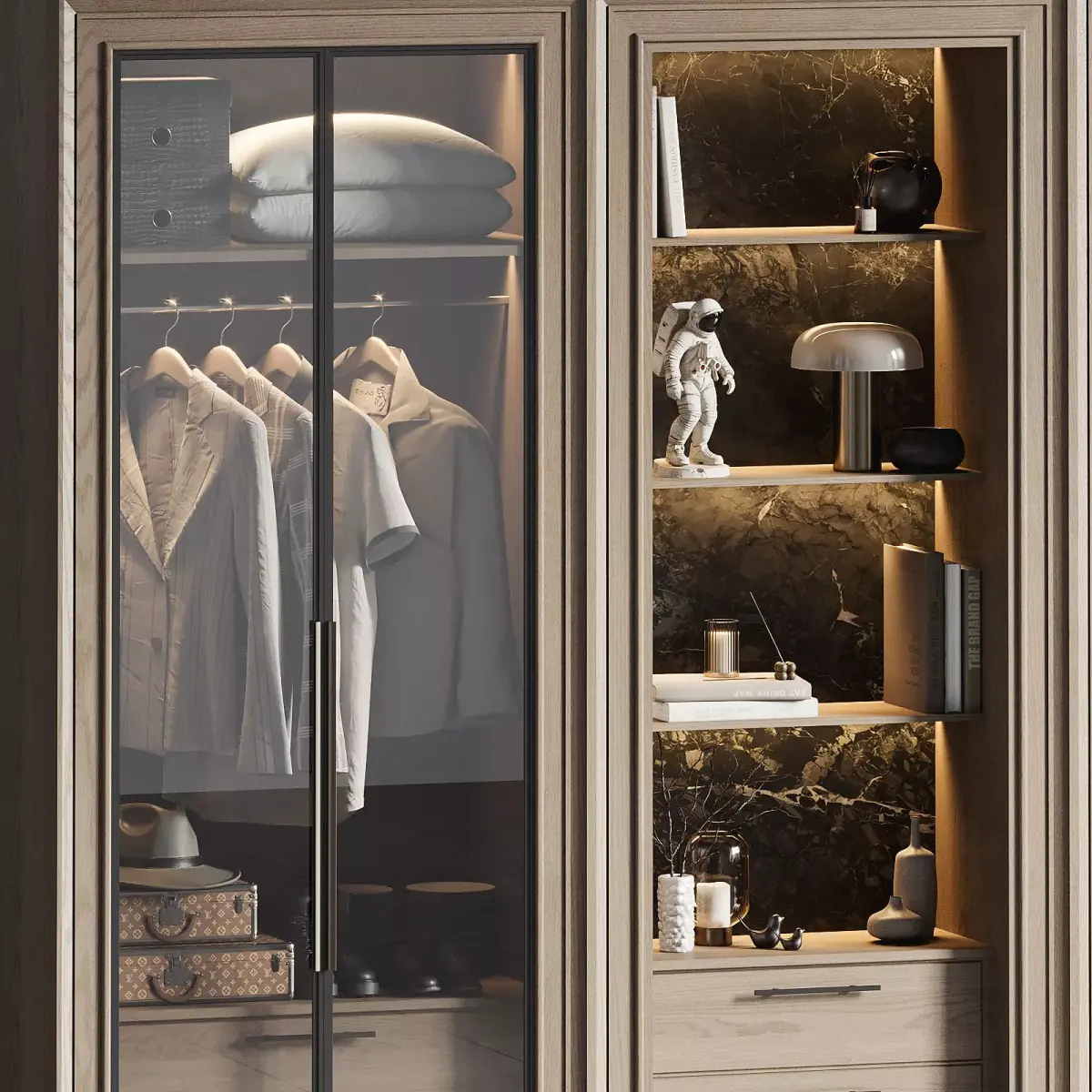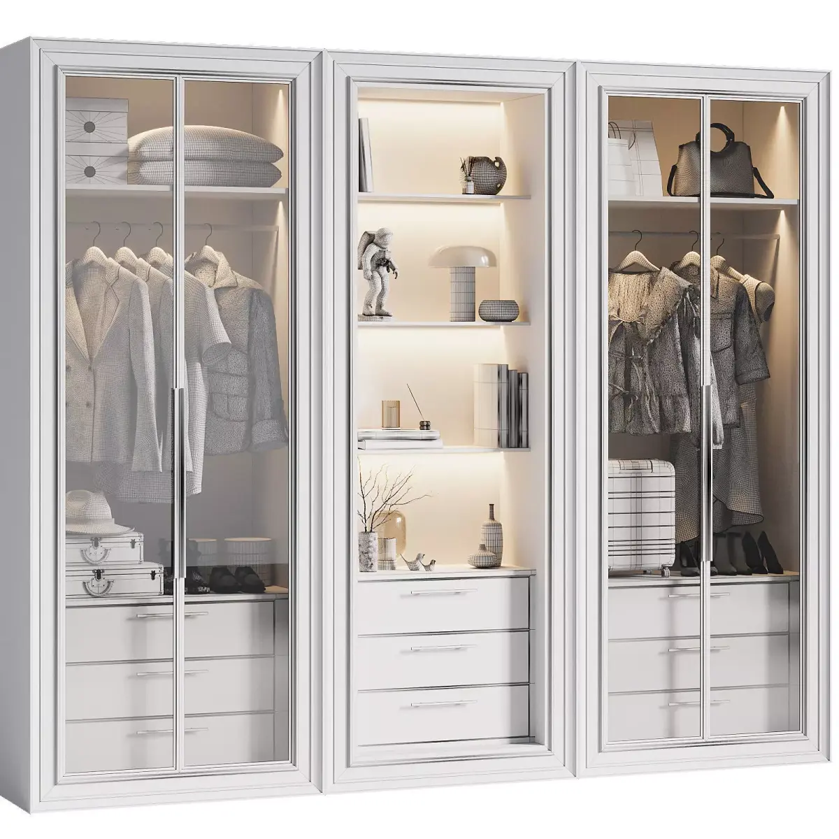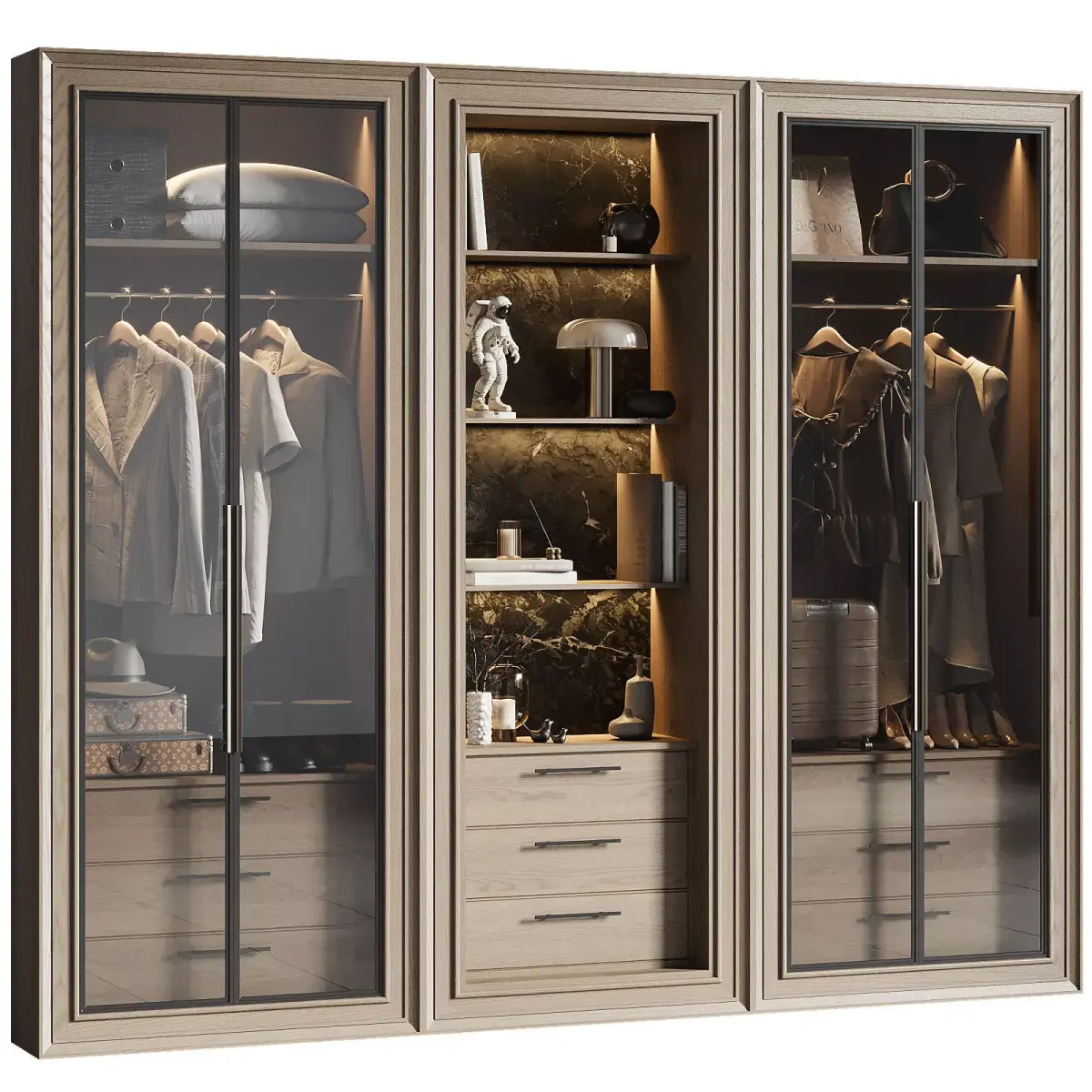 Modern contemporary styleRealistic materials (Vray + Corona)LED interior lighting for premium lookOrganized storage with clothes, bags, and accessories