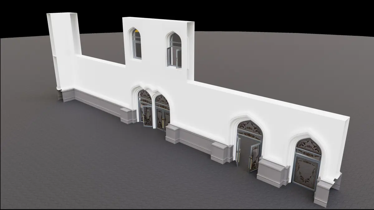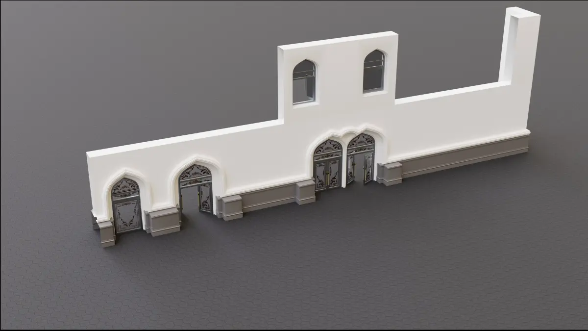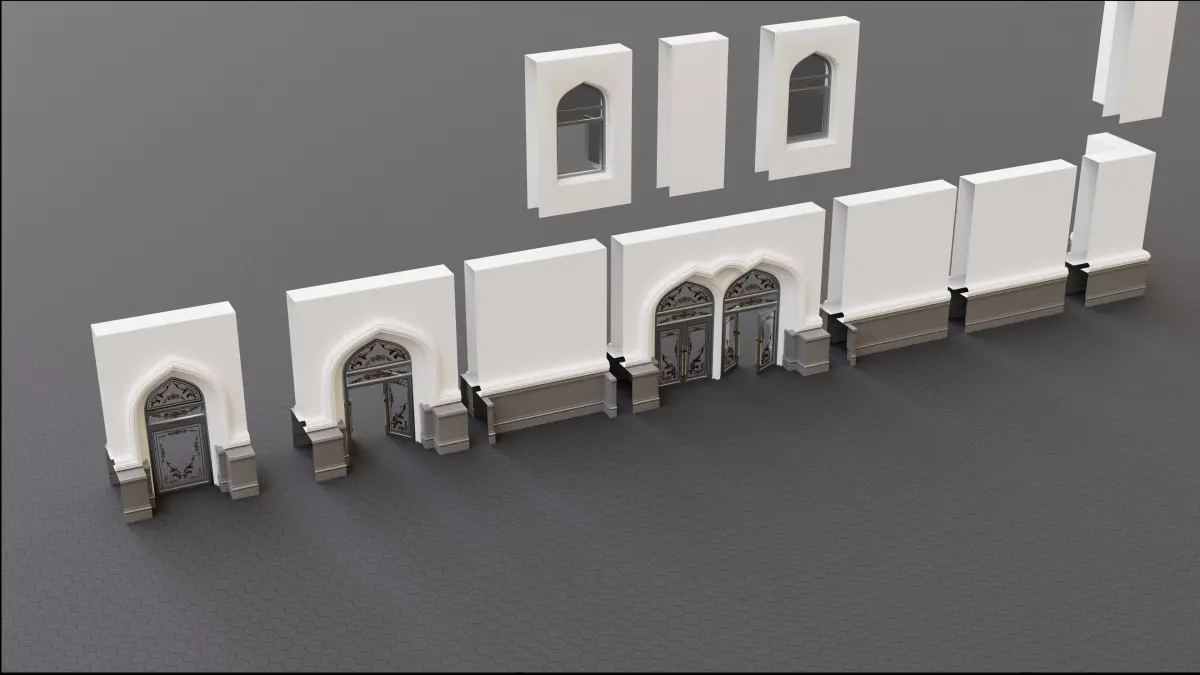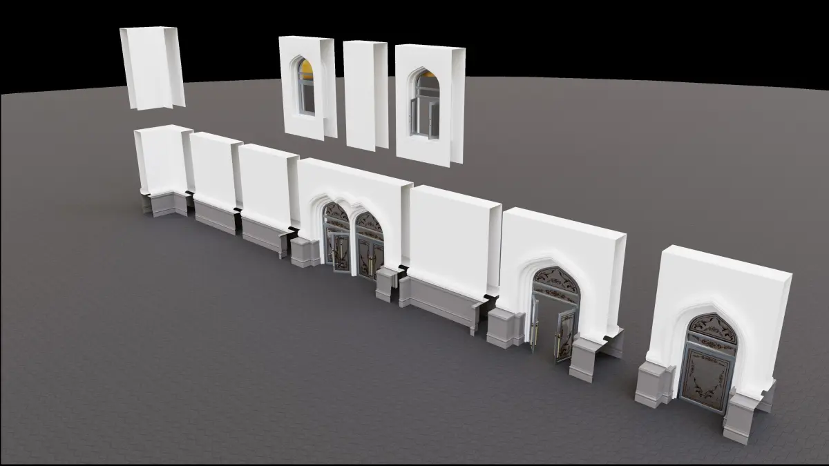 The continuous building, 11 blocks of Gates Walls and Windows. You can make the building as long as you want and the way you want it to be, You can use the first floor alone or the first and the second floor together, what you see is one example of what you can do, arrange them the way you see fit. the materials, textures, and UVs are included in the original file also the textures included in a separate folder if you need it for the other file format, you can check my other models too