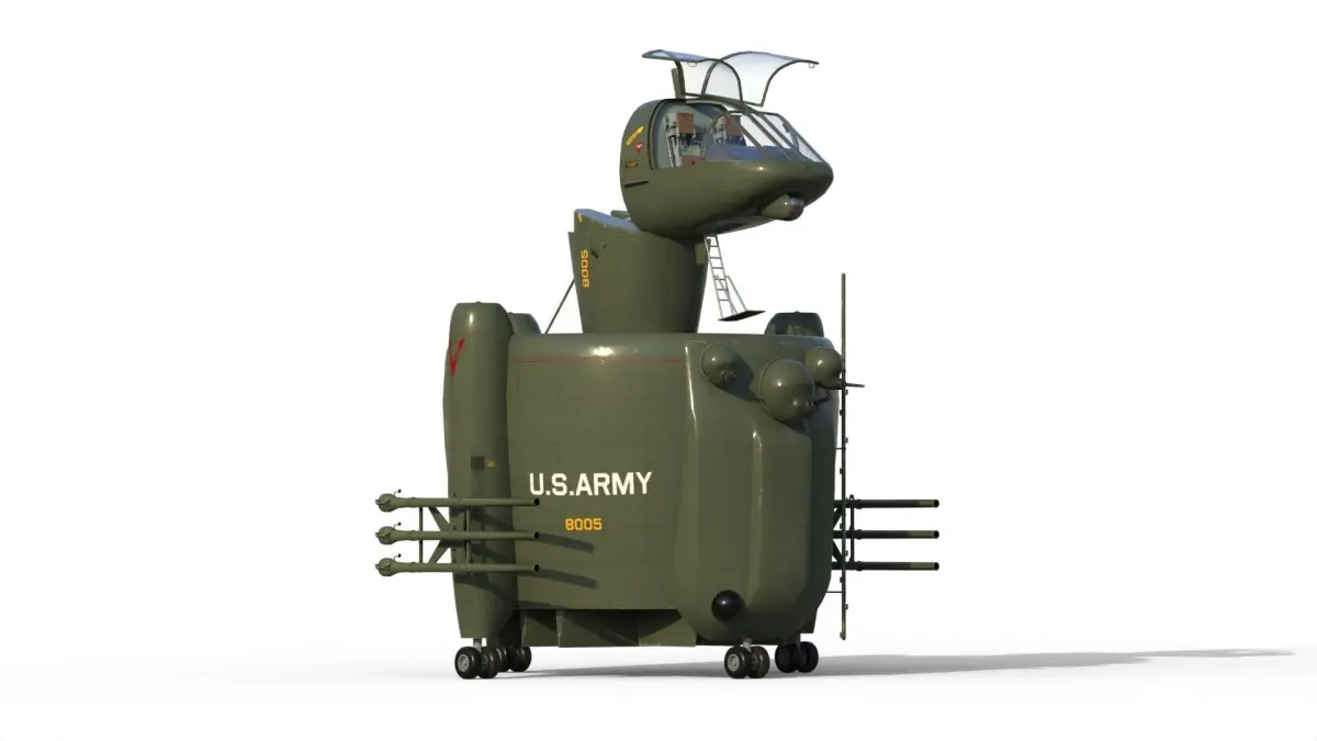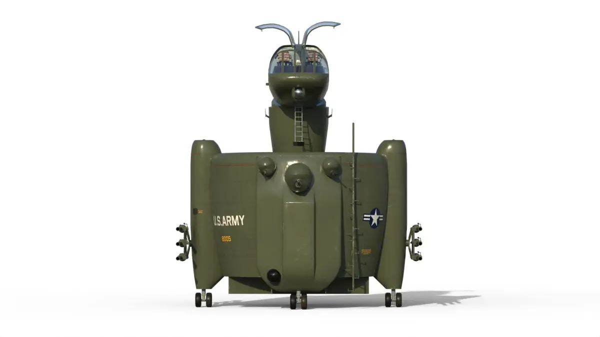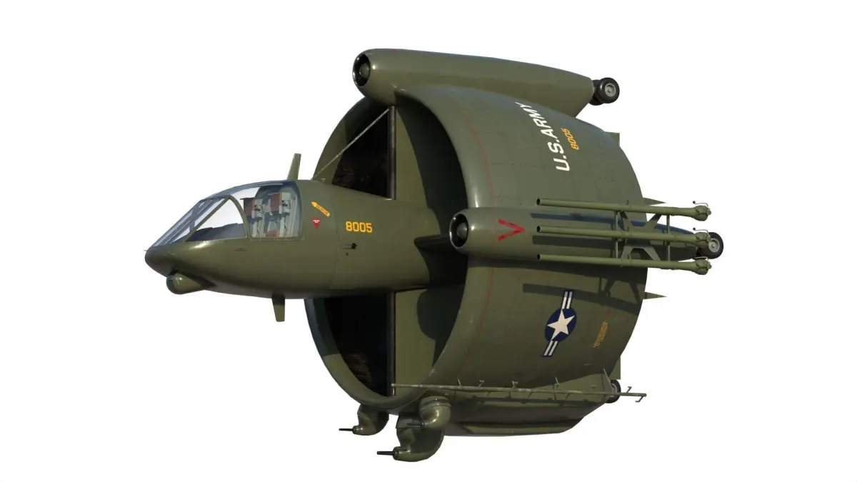 The most unique proposal in the AAFSS competition came from the San Diego division of Convair. The Model 49 did not fit the normal mold for either an airplane or a helicopter, and represented something entirely new. Propulsive power came from turbine engines driving counterrotating propellers within the shroud. Convair believed that the system was inherently more reliable than a conventional helicopter, and pointed out the only pilot control inputs involved directional control and setting rotor blade angle and engine speed. The crew of two occupied an articulating capsule on top of the shroud and was provided with a full array of sensors. The engines, fuel, crew capsule, and avionics bays were equipped with dual-property steel armor for protection against 12.7-mm projectiles.