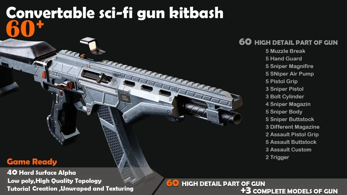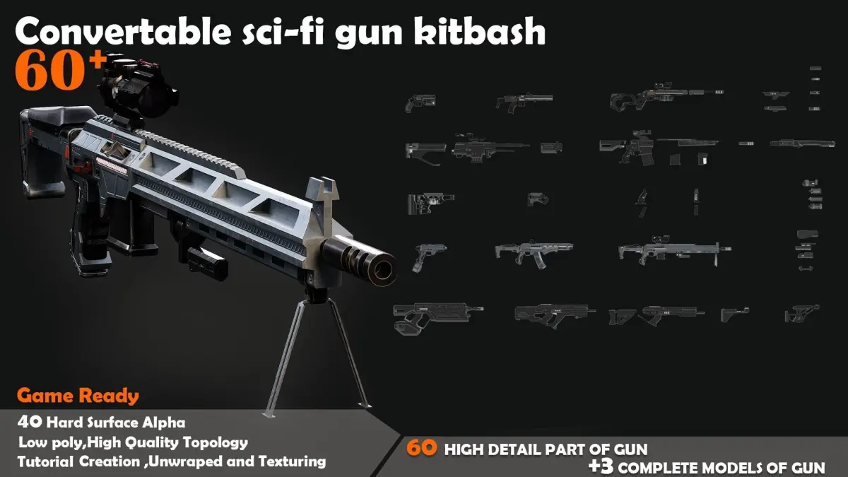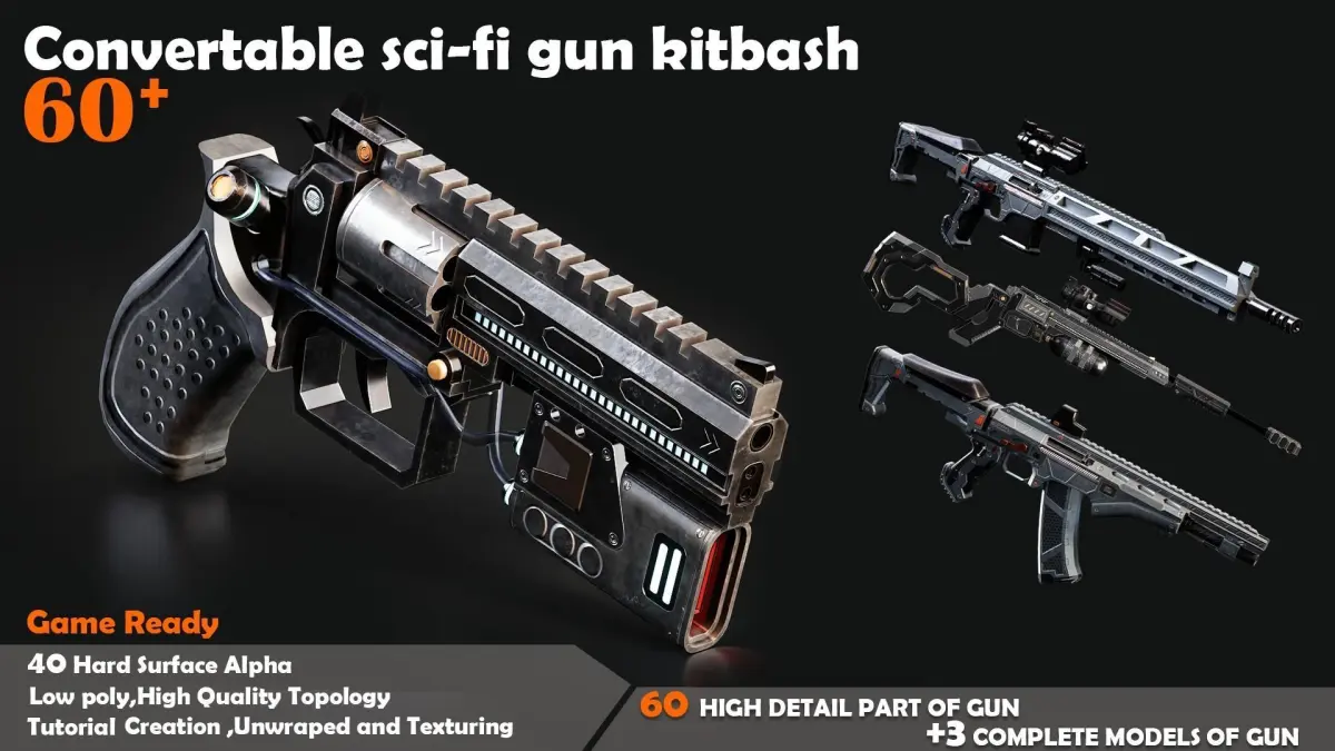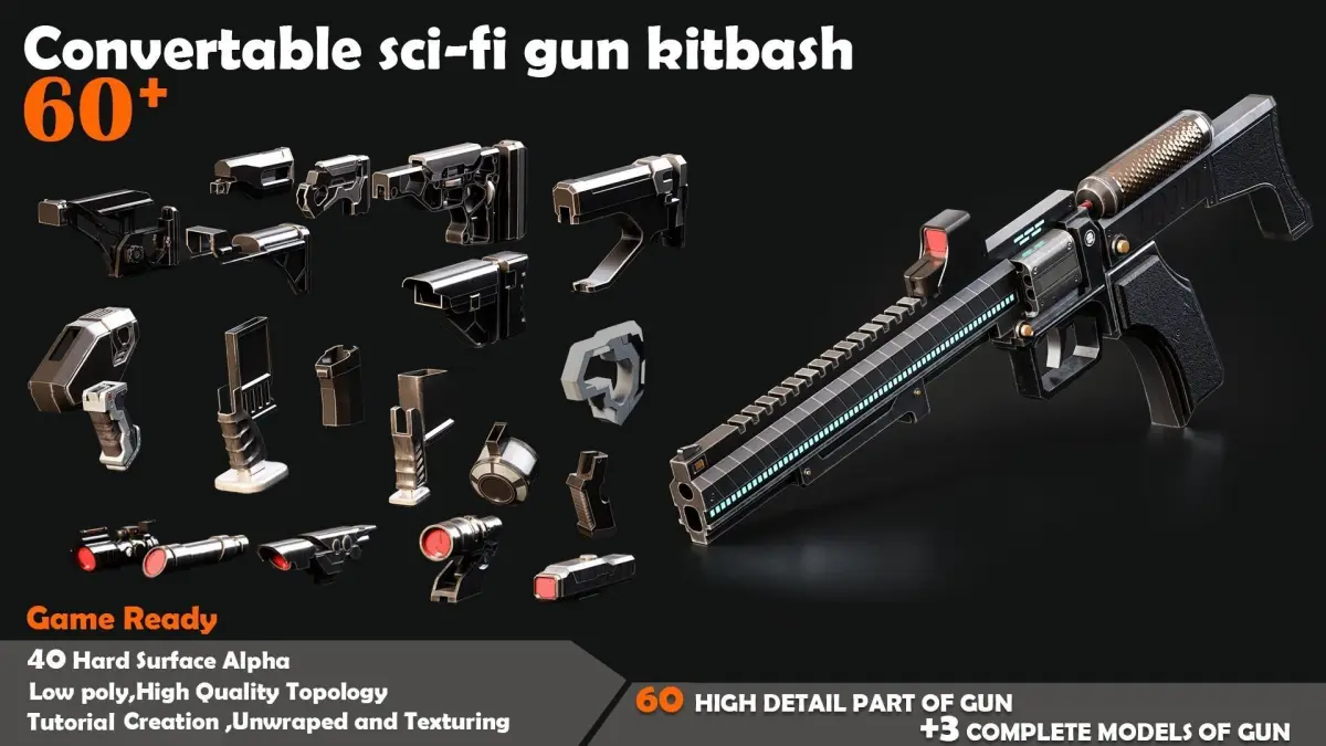 Convertable Sci-fi Kitbash60 hard surface models of gunsYou can create your gun with this kitbashHand Gun,Assault Or Sniper And you can costumize themAll parts are unwrapedand they are ready for animationModels are low poly,but the have high qualityTextures are 4kWe created 40 alpha for texturingAnd Also we record tutorials Includes:Creation,unwraped and texturing in substance painterKitbash Include:5 Muzzle Break5 Hand Guard5 Sniper Magnifire5 Sniper Air Pump5 Pistol Grip3 Sniper Pistol3 Bolt Cylinder4 Sniper Magazin5 Sniper Body5 Sniper Buttstock3 Different Magazine2 Assault Pistol Grip5 Assault Buttstock3 Assault Custom 2 TriggerBlnder,Max,Obj And FBXMaxversion is 2018