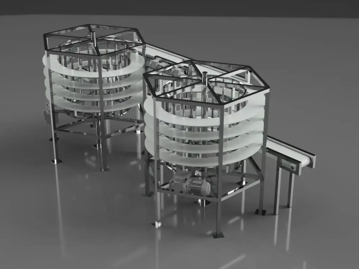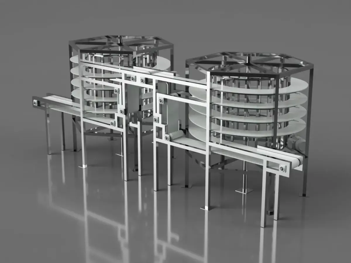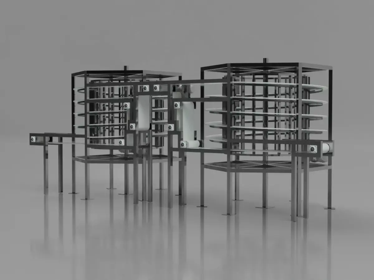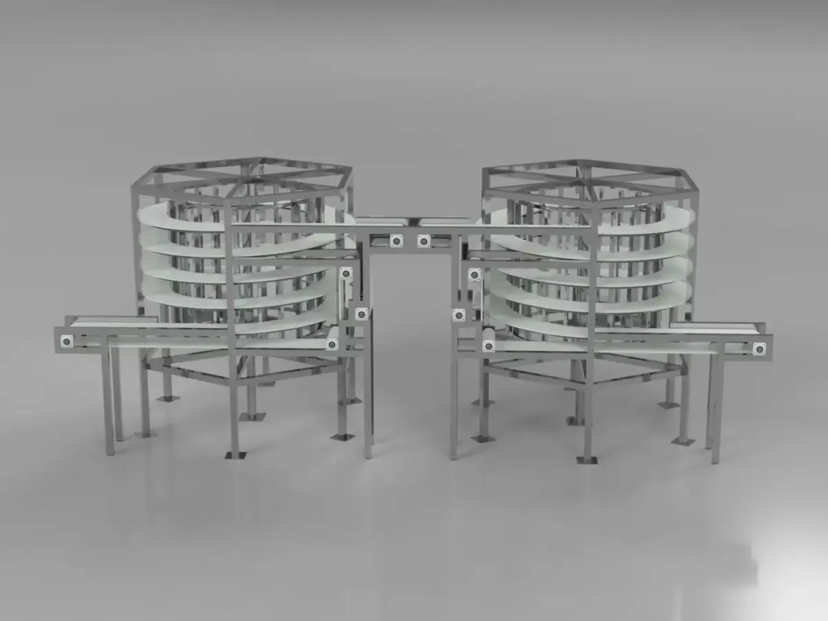 This conveyor belt model is a conceptual representation of a dual spiral conveyor system designed for vertical product handling in the industry. The system features two spiral conveyor belts, one ascending and one descending.