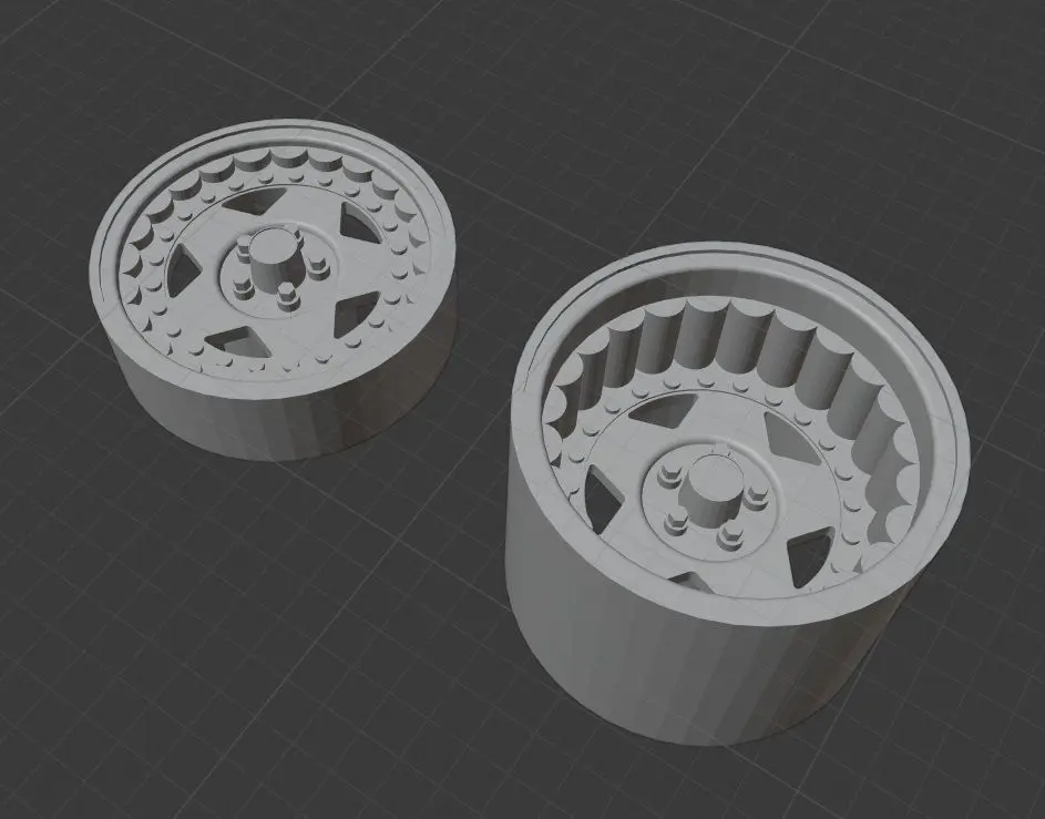 Rims would be approx 15 inch diameter (to scale) with skinny front runners and wide rears.