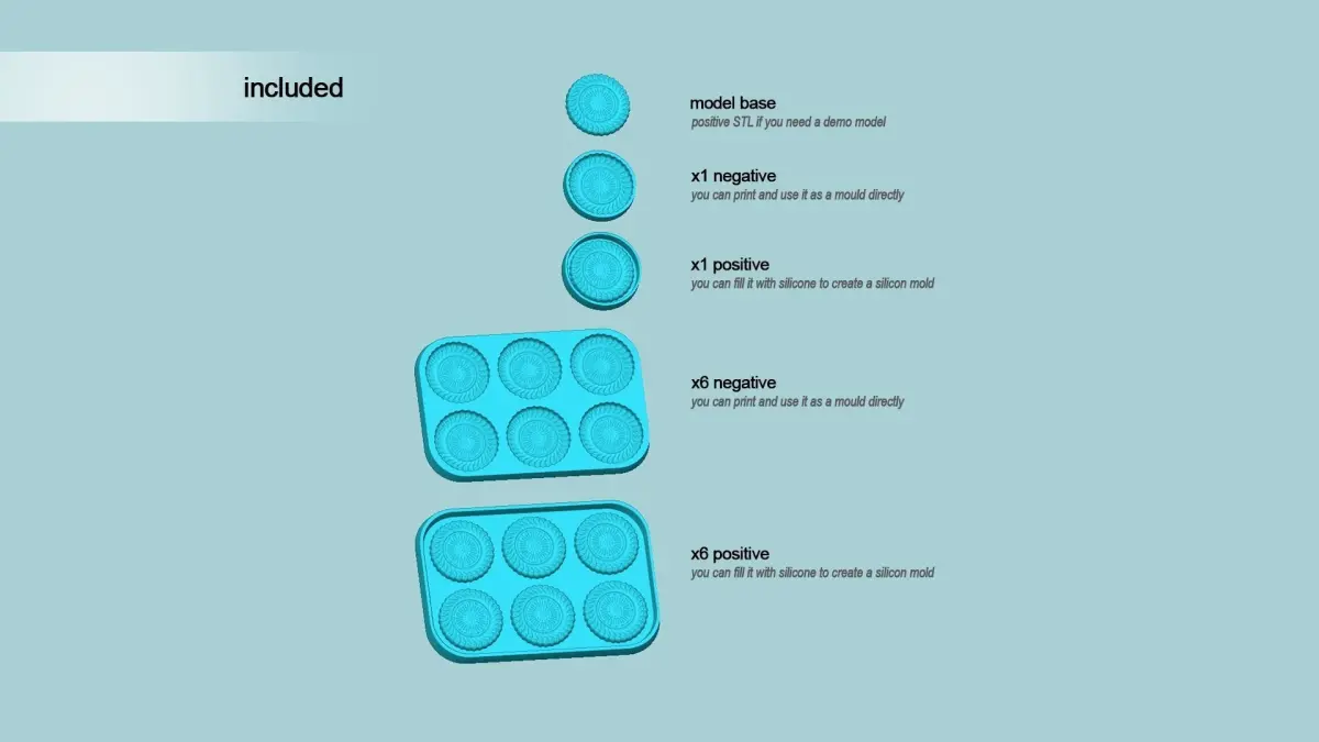 The base model is used for a example printing.The negative pieces can be used as molds itself.The positive pieces can be used to create silicon molds, by filling.