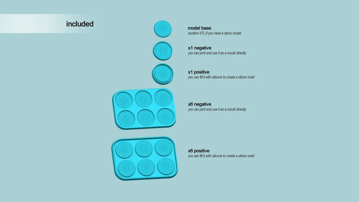 The base model is used for a example printing.The negative pieces can be used as molds itself.The positive pieces can be used to create silicon molds, by filling.