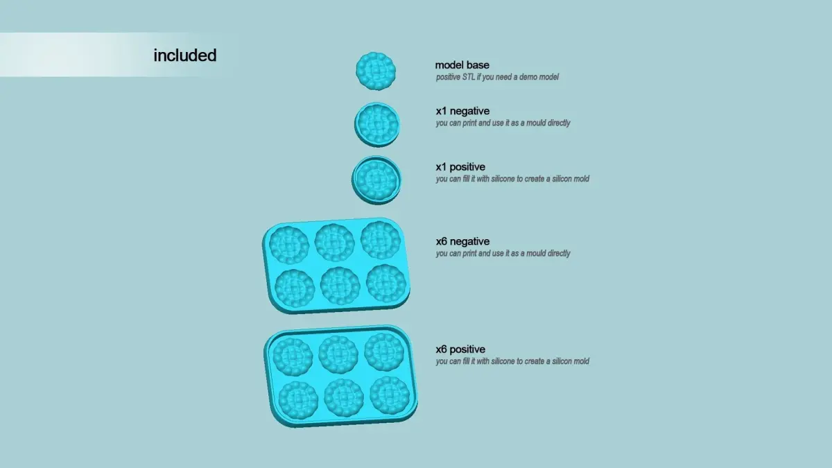 The base model is used for a example printing.The negative pieces can be used as molds itself.The positive pieces can be used to create silicon molds, by filling.