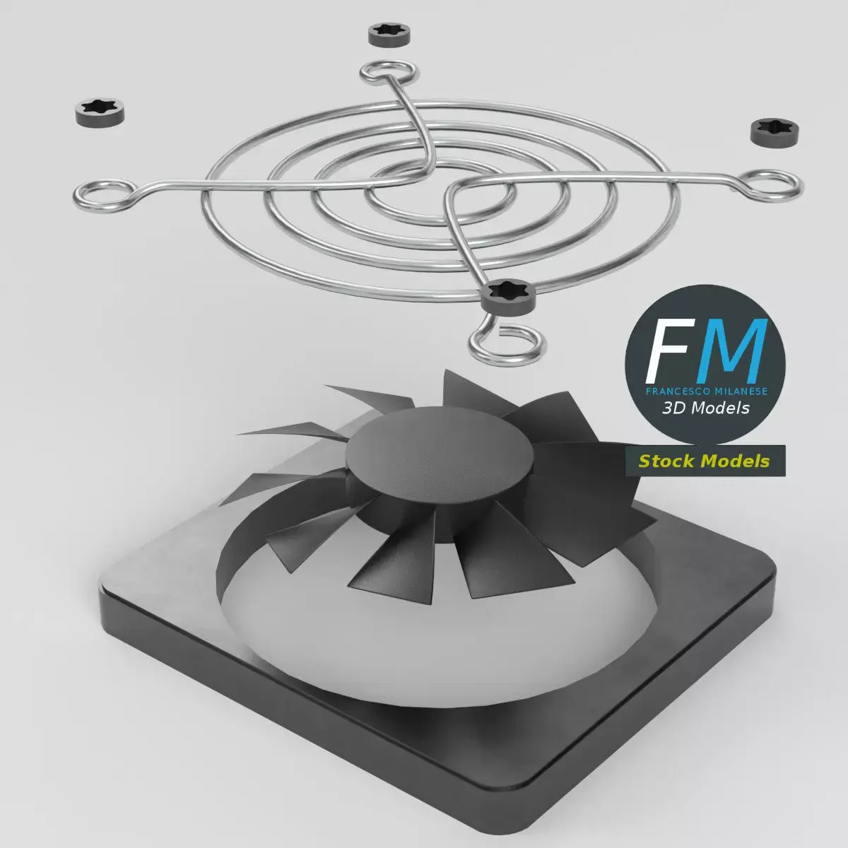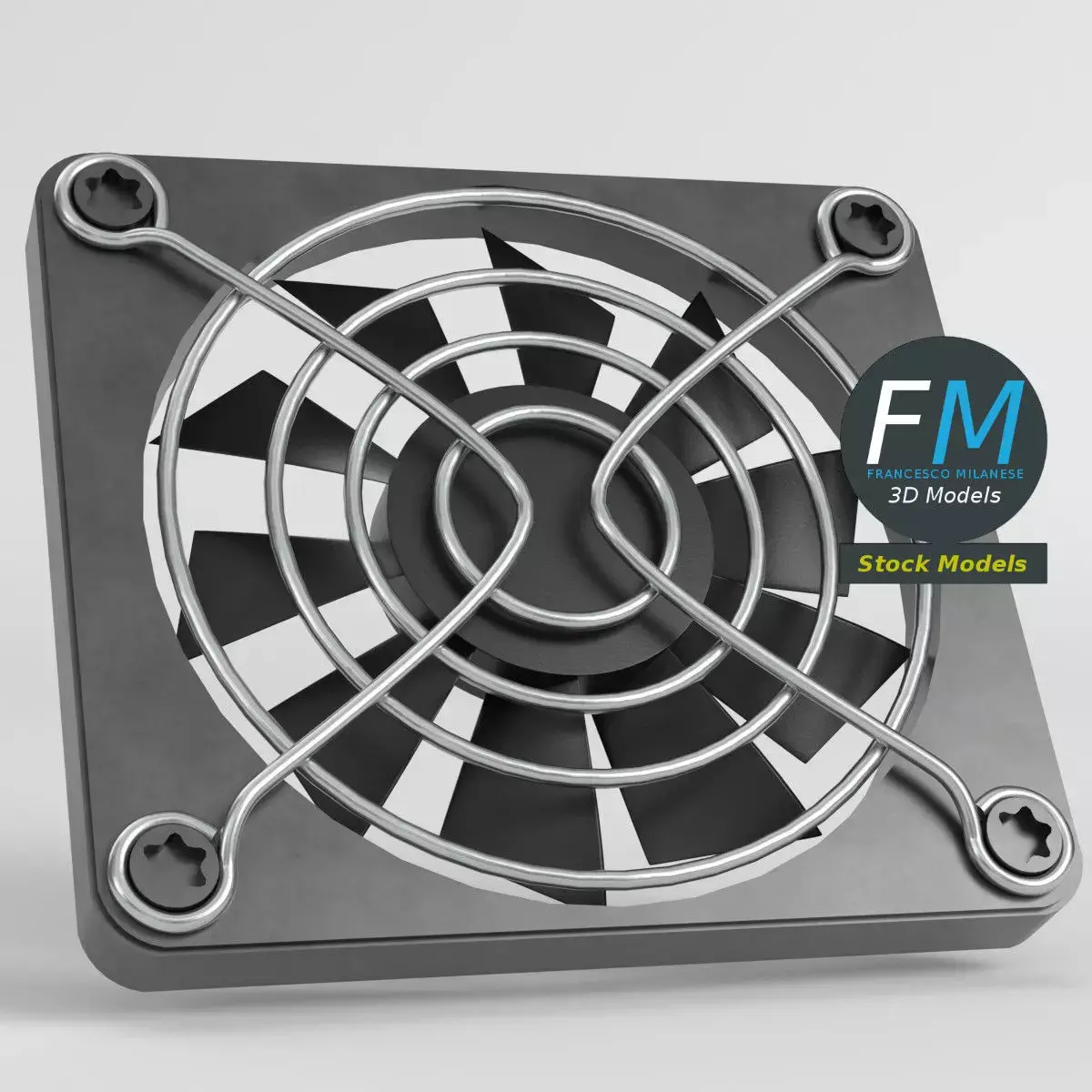 Computer cooling fan with protective grill and mounting screws 3D Model, ideal for PC or data center server cases and electronics projects. 7 individual objects (4 screws, 1 plate, 1 fan, 1 grill), sharing the same non overlapping UV Layout map, Material, and PBR Textures set. Production-ready 3D Model, with PBR materials, textures, non overlapping UV Layout map provided in the package.Quads only geometries (no tris/ngons).Easily customizable: UV unwrapped geometries; UV Layout maps provided in the package as png with alpha images.Each Object, Material or Texture provided in the package has a unique, meaningful name.Made with Blender 4.5.0 LTS with Cycles Principled BSDF PBR shader with textures included (Eevee compatible), then exported to OBJ and FBX; materials and textures made with Substance Painter (Adobe 3D Painter), exported for PBR, Cycles, V-Ray, Unity, Unreal.PROMO IMAGES: the first image has been rendered in Cycles for Blender; in particular, you can find 11+ promo images in this description: