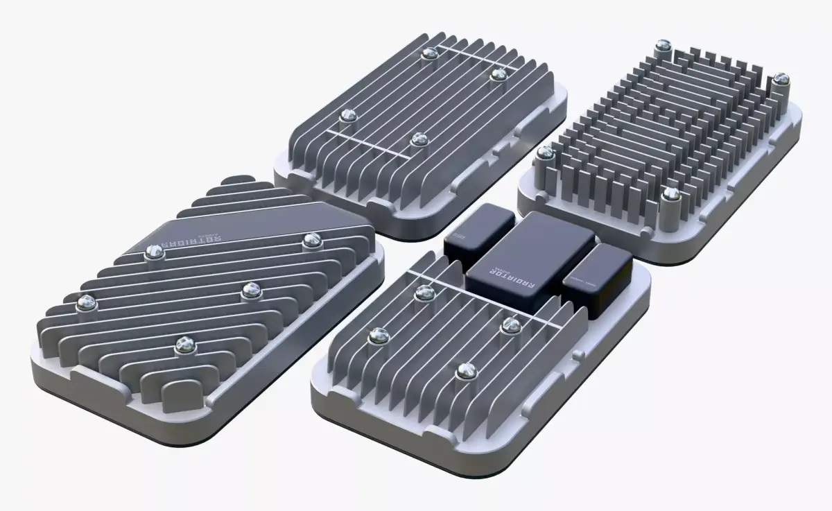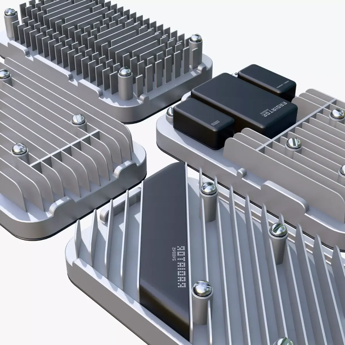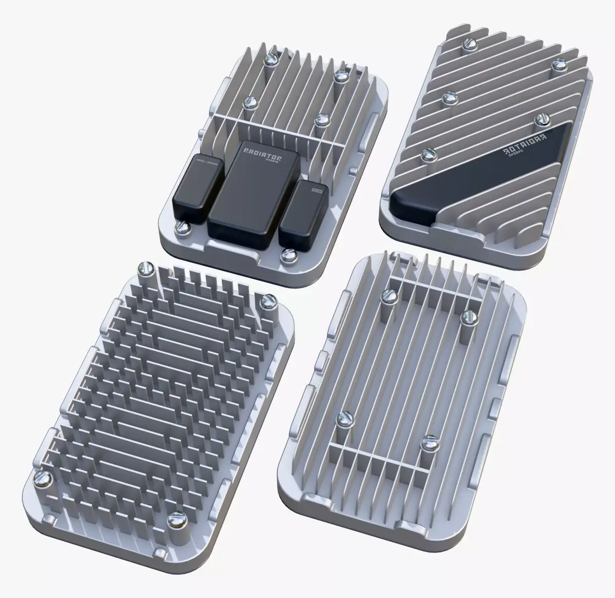 Set of 4 cooling heatsinks for electronics. The items are made of matte silver metal and feature various fin configurations for efficient heat dissipation. Some models are equipped with black decorative covers and additional blocks, with chrome mounting screws installed at the corners.