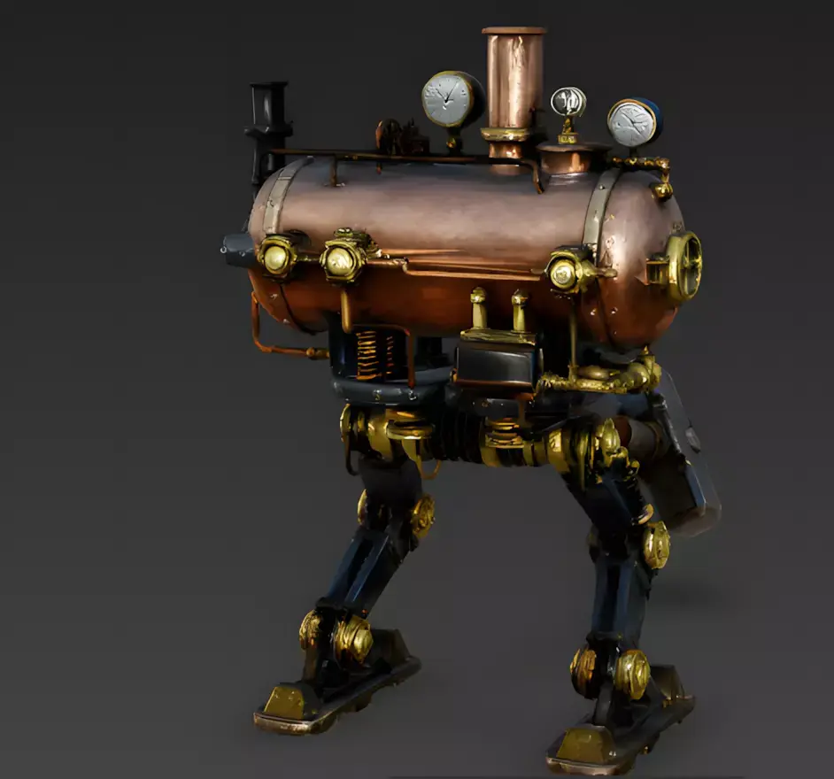 Analog Gauge Cluster Mounted prominently on top of the hull is a cluster of analog pressure gauges and valves. These dials add a layer of functional realism, suggesting that the machine requires constant monitoring to prevent overheating or exploding, a classic trope of steam-powered technology.