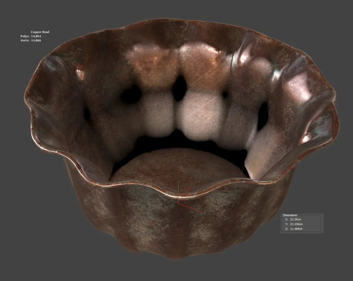 Enhance your historical or fantasy scenes with this meticulously crafted 3D model of an Ancient Copper Bowl. This model boasts exceptional detail and realism, perfect for adding a touch of antiquity to your projects.