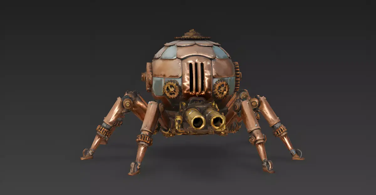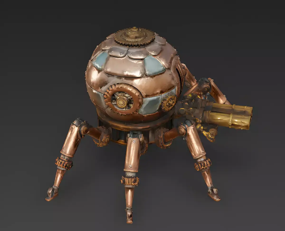 The Overall ConceptThis asset is a masterpiece of clockwork warfare. It is a compact, spherical spider-tank that moves on six articulated copper legs, perfect for serving as a nimble guardian, an automated turret, or a formidable mechanical enemy in steampunk or alternate-history game worlds.