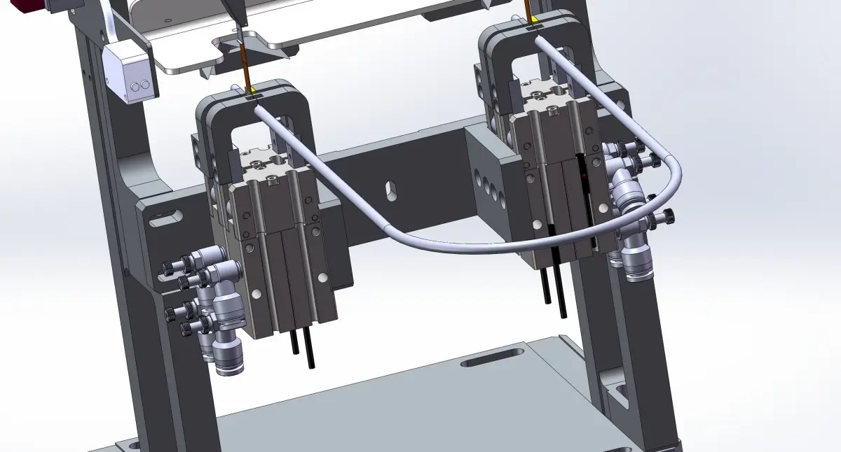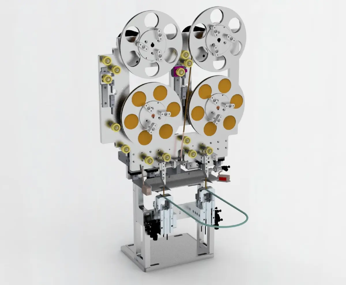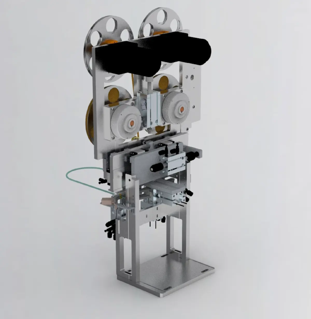The mechanism through the coil feeding mechanism, the use of tension controller to control, to ensure that the coil conveying smooth, taut. Through many times of roller guide, conveying to wire mechanism out, using the cutting mechanism to cut off the wire, the mechanism is a set of automatic feeding cutting mechanism.