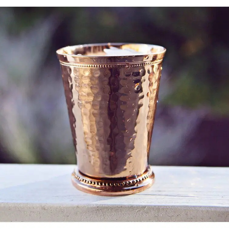 - 100% pure copper hammered Moscow Mule Mint Julep cup, 12 ounce size. Not tainted by other metals. Food-safe lacquer coating helps preserve beauty and lustre. Perfect size for a Moscow Mule or Mint Julep- Also great for other cold beverages - Keeps drinks cold and delicious!