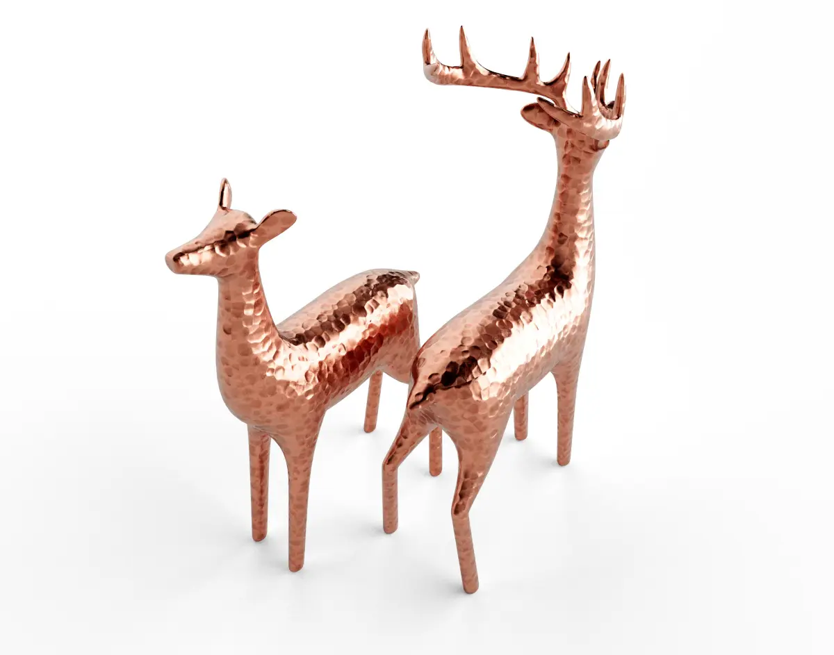 A set of a stag and doe hammered copper reindeer decorations