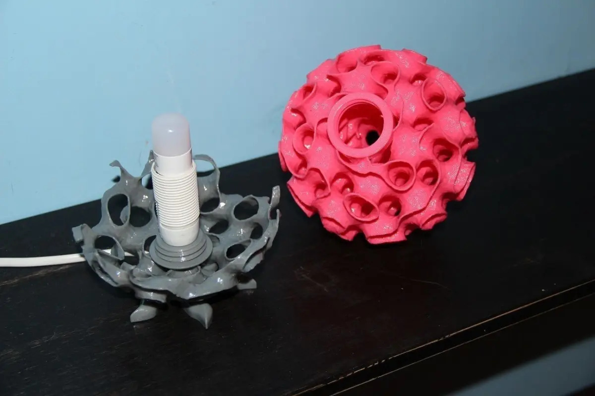 Coral lamp shade with lamp base. Shade and base has screw threads which connect them. Lamp base has holes for wire and for sleeve (recommended 10x1m threaded sleeve) to mount bulb holder. Dimensions (mounted) 14,2 x 14,2 x 16,9 cm.