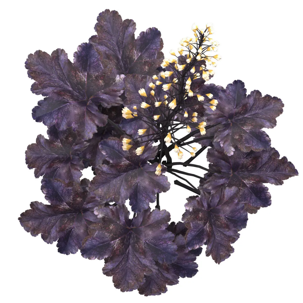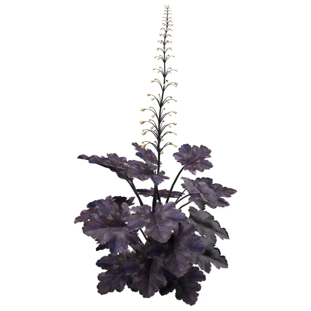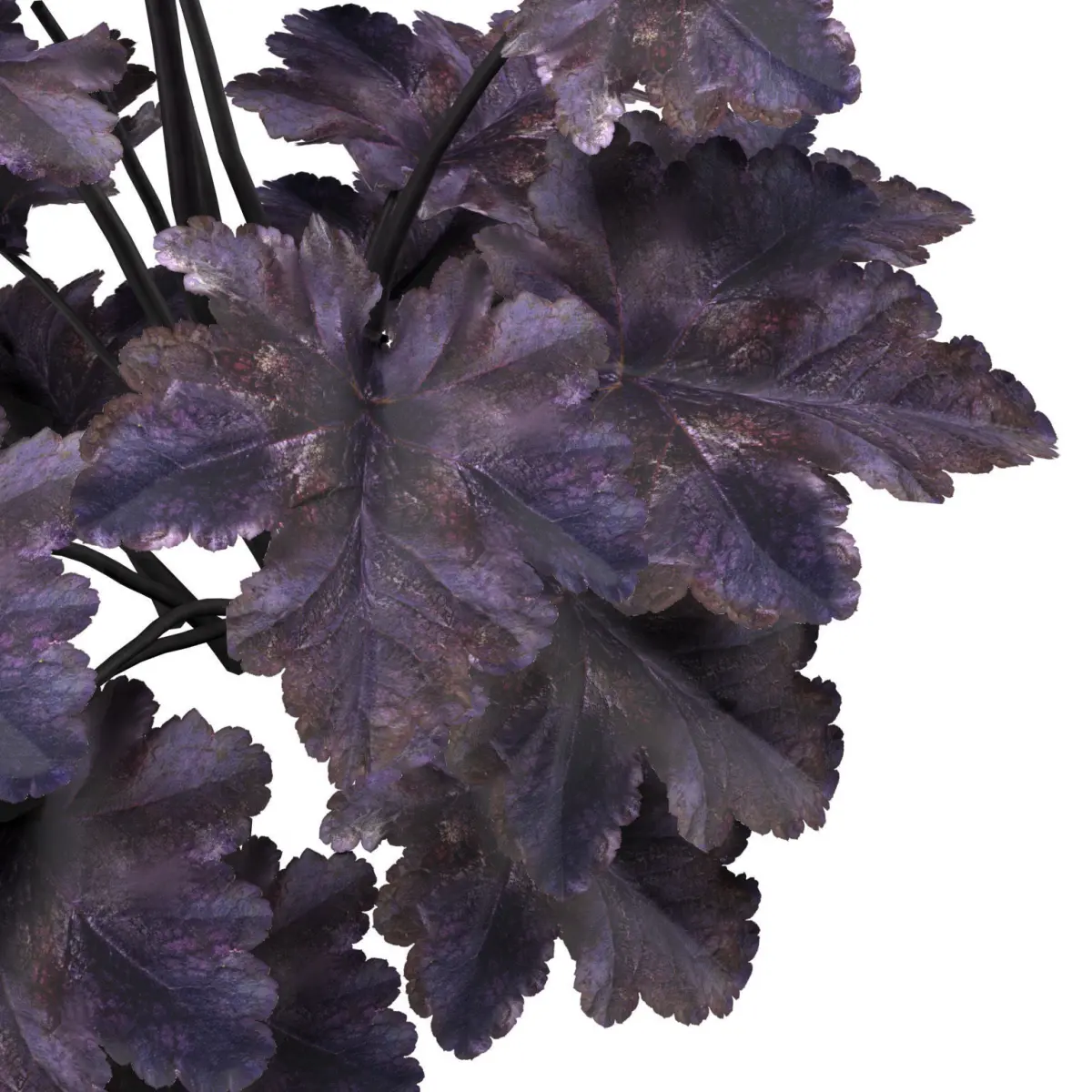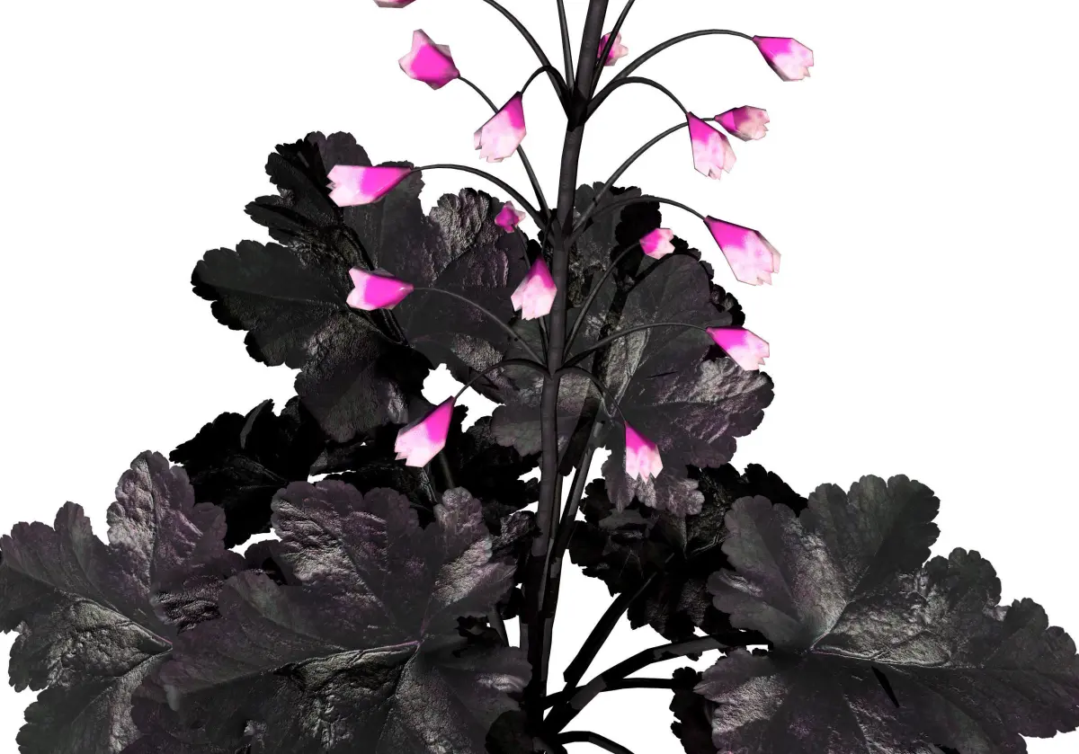 Primo Black Pearl Coral Bells 3D pack is a collection of four plant season variations of the Heuchera hybrid species, available on the marketplace. The pack includes the Primo Black Pearl Coral Bells plant, which is a stunning black foliage plant that can thrive in both shade and sun. The plant forms an incredibly dense habit of shiny, jet black leaves with scalloped, ruffled edges and rosy purple undersides. Coralbells Primo ‘Black Pearl’.