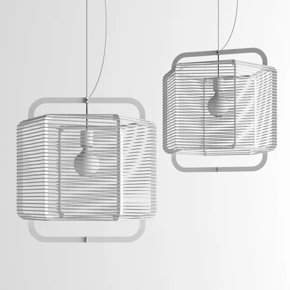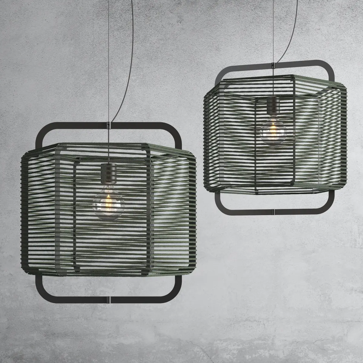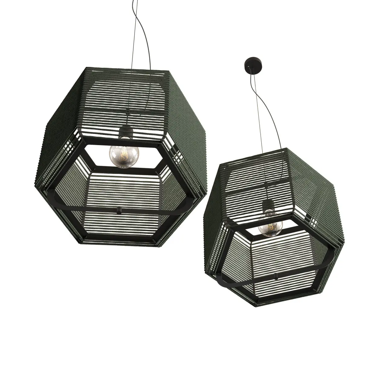Pendant lamp from the Corda collection. Ceiling lamp with an elegant design created to illuminate bedrooms and living rooms in dark tones. Textured black metal structure with polypropylene cords around as decoration. You can choose the rope finish in sand, black or seaweed green tones.