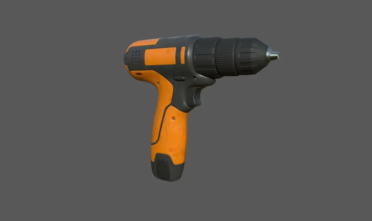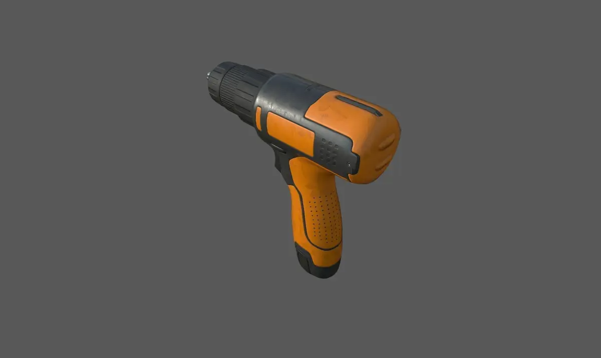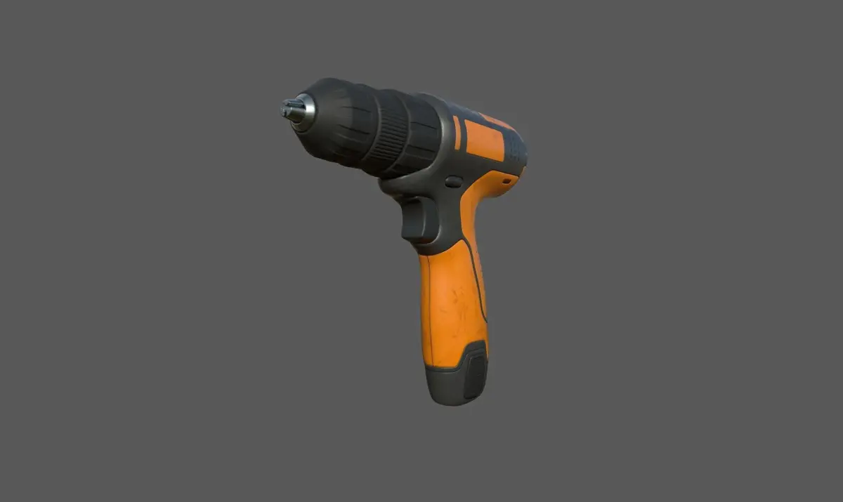 Cordless drill in grey and orange colors. Arms holding the eventual pin as a separate model. Trigger is NOT a seprate model.