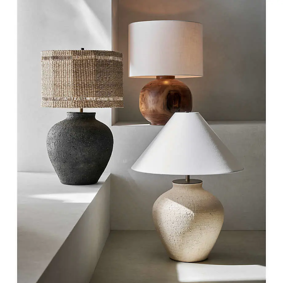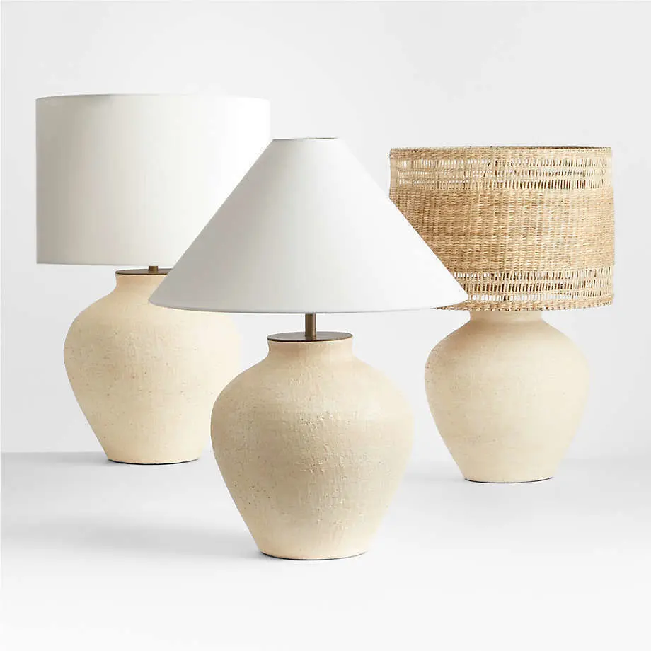 Corfu Cream Table Lamp with Linen Taper ShadeCeramic with painted finishIvory linen taper shade1 e26 socketIncludes one 9W LED bulb; accommodates 75W or energy-efficient equivalent bulb98" black cordRotary switch on socketMade in The Philippines