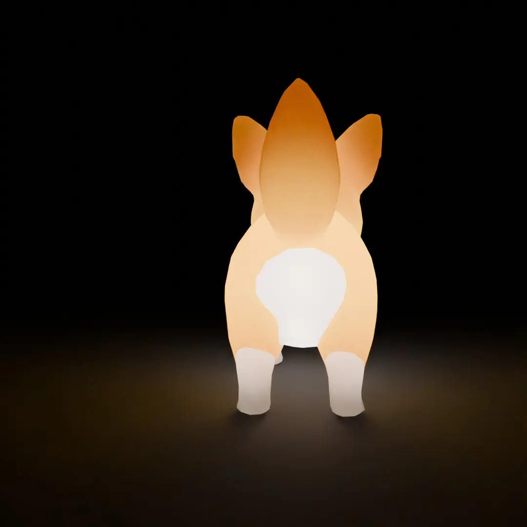 This is a Blender 3D model of an indirect light featuring a fluffy corgi.The characteristic round hips and short legs are deformed in an adorable way, and the lighting is designed to color the space with gentle light. Just by placing it in a room, you can add a sense of healing and playfulness.