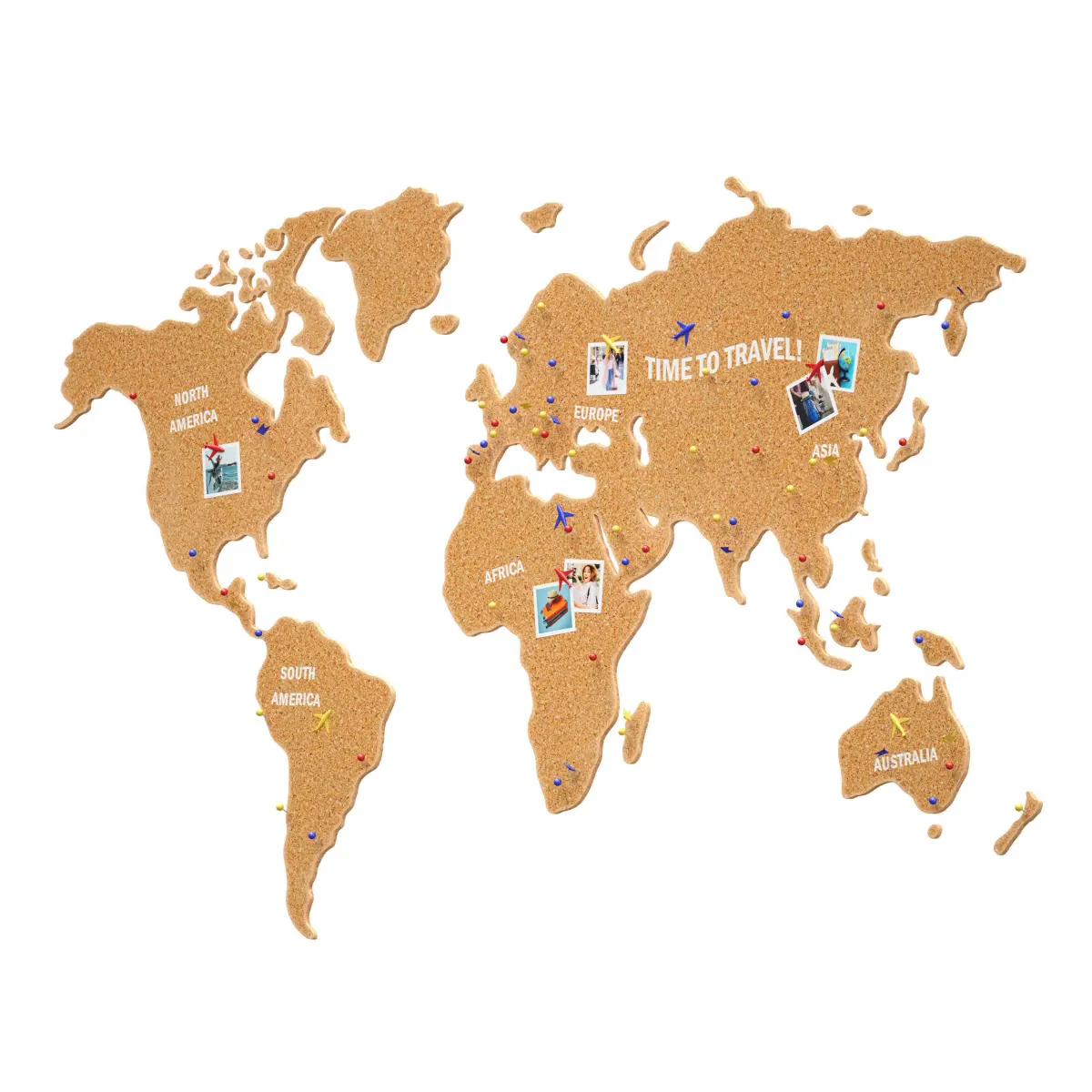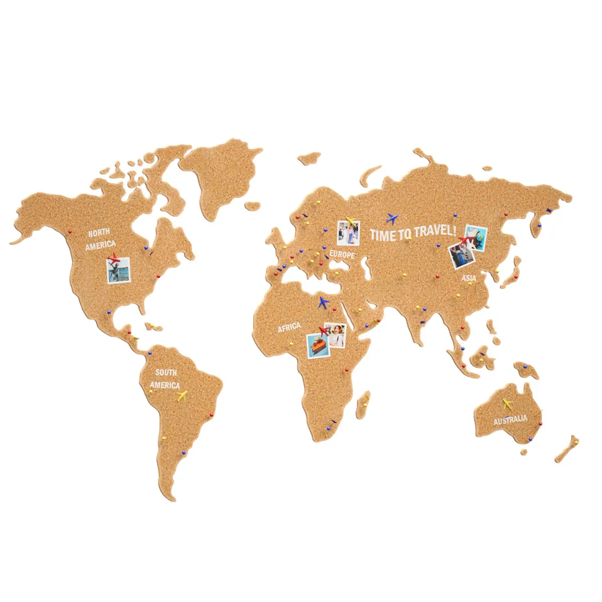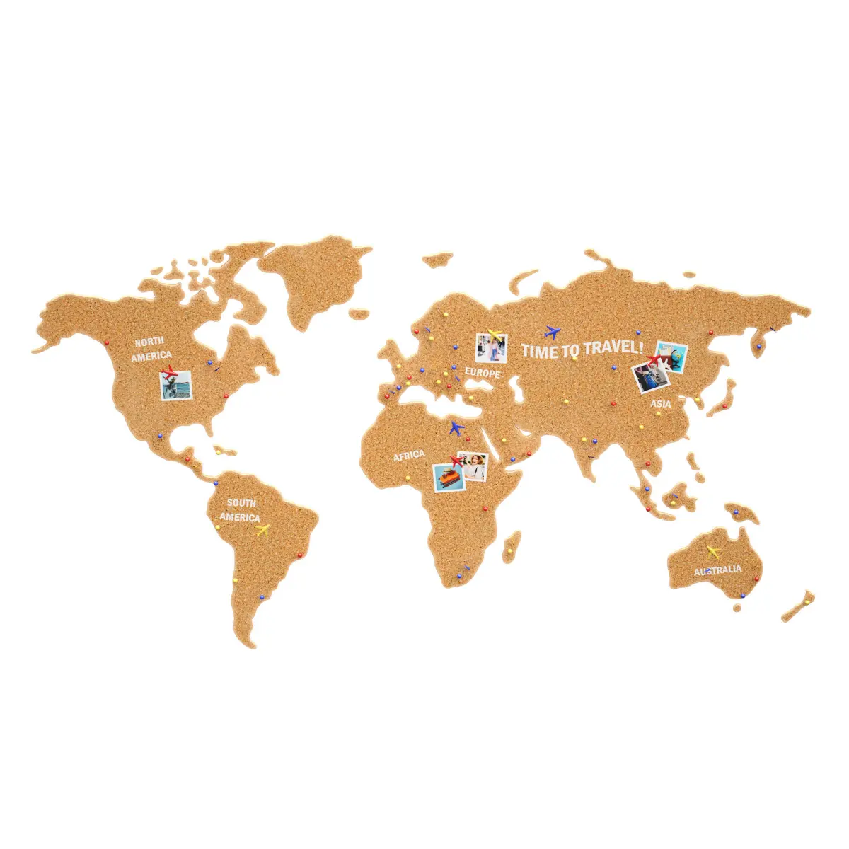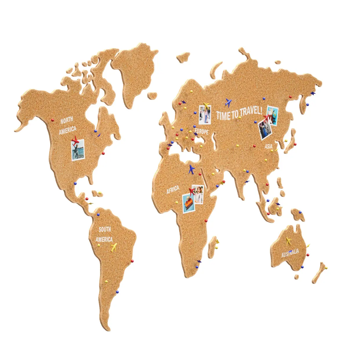 3D model of the world map for wall hanging as wall decor and information stand. Made of cork, cork tree, cork covering. The map has white embossed inscriptions with the names of the continents and the inscription TIME TO TRAVEL!. On this map you can place photos and information marks about travels, the marks are made in the form of pins. Pins of several types and different colors: flags, spherical and in the form of an airplane. This map can be suitable for the interior of a house, office, children's room, etc.