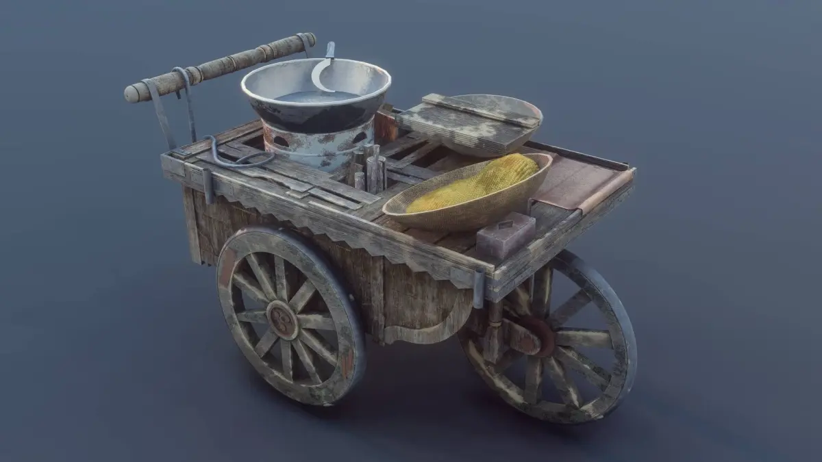This is a highly detailed 3D model of a traditional corn street cart (rerhi) designed in SketchUp and textured in **Blender **3.4 using 1K PBR materials. The cart features a realistic design with 3 functional tiers, wooden planks, metal nuts, a stove with a hot sand wok (crarhi), corn tools, and a container filled with boiled corn. Perfect for use in urban street scenes, South Asian markets, or game environments.