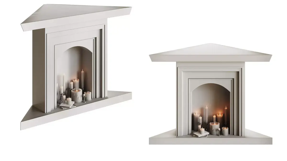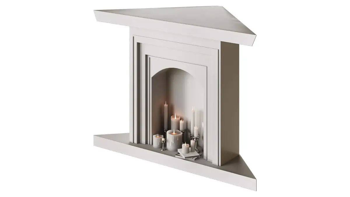 Perhaps you were looking for:Corner False fireplace, white plaster fireplace, candle, candle holder, straight fireplace, fireplace portal, arch, fire, decorative fireplace