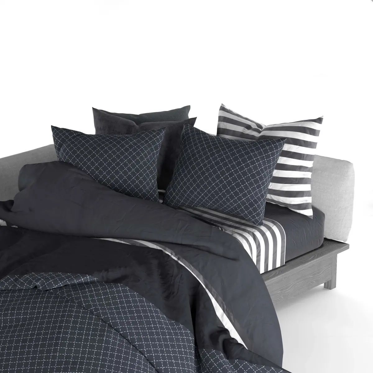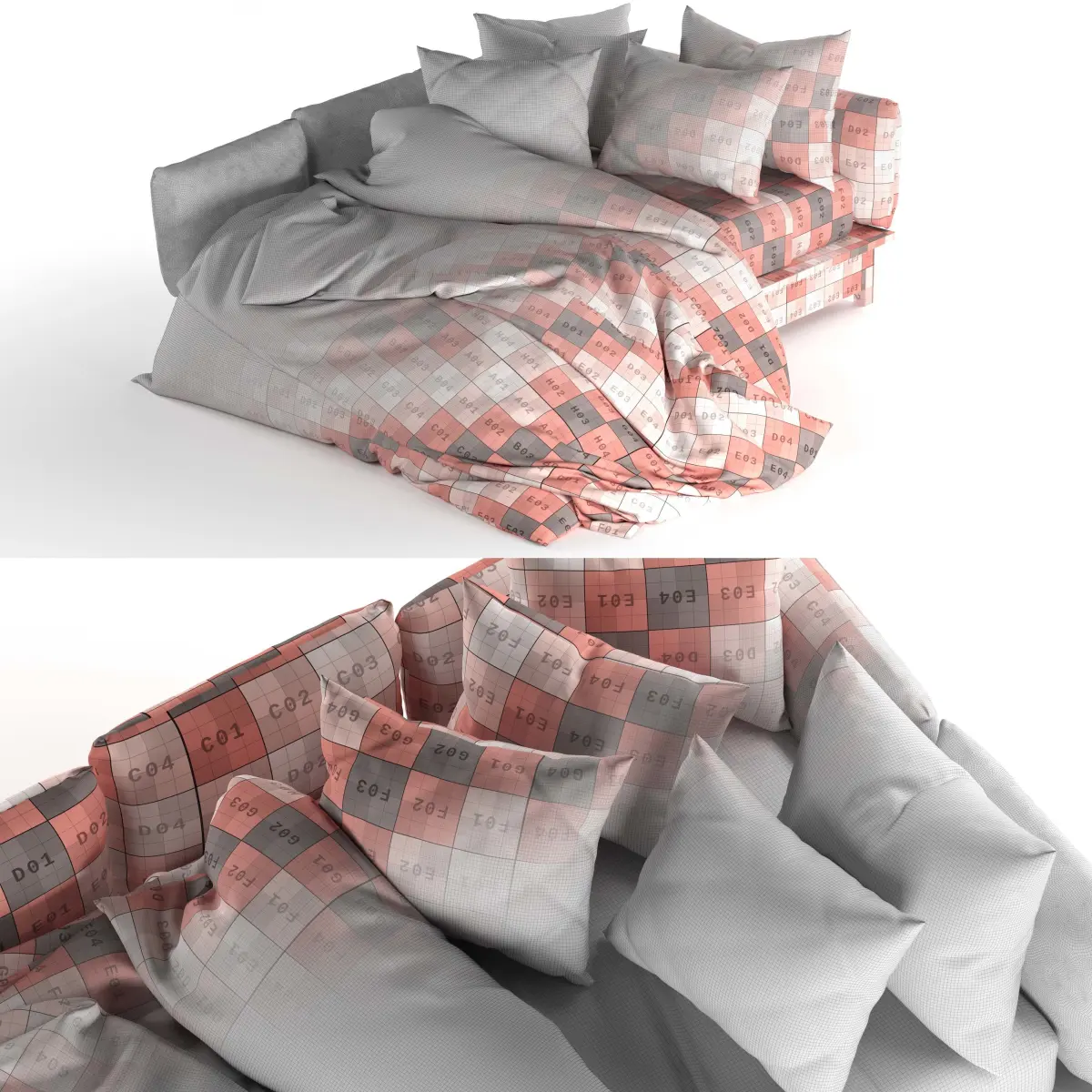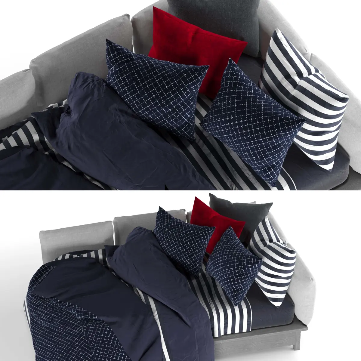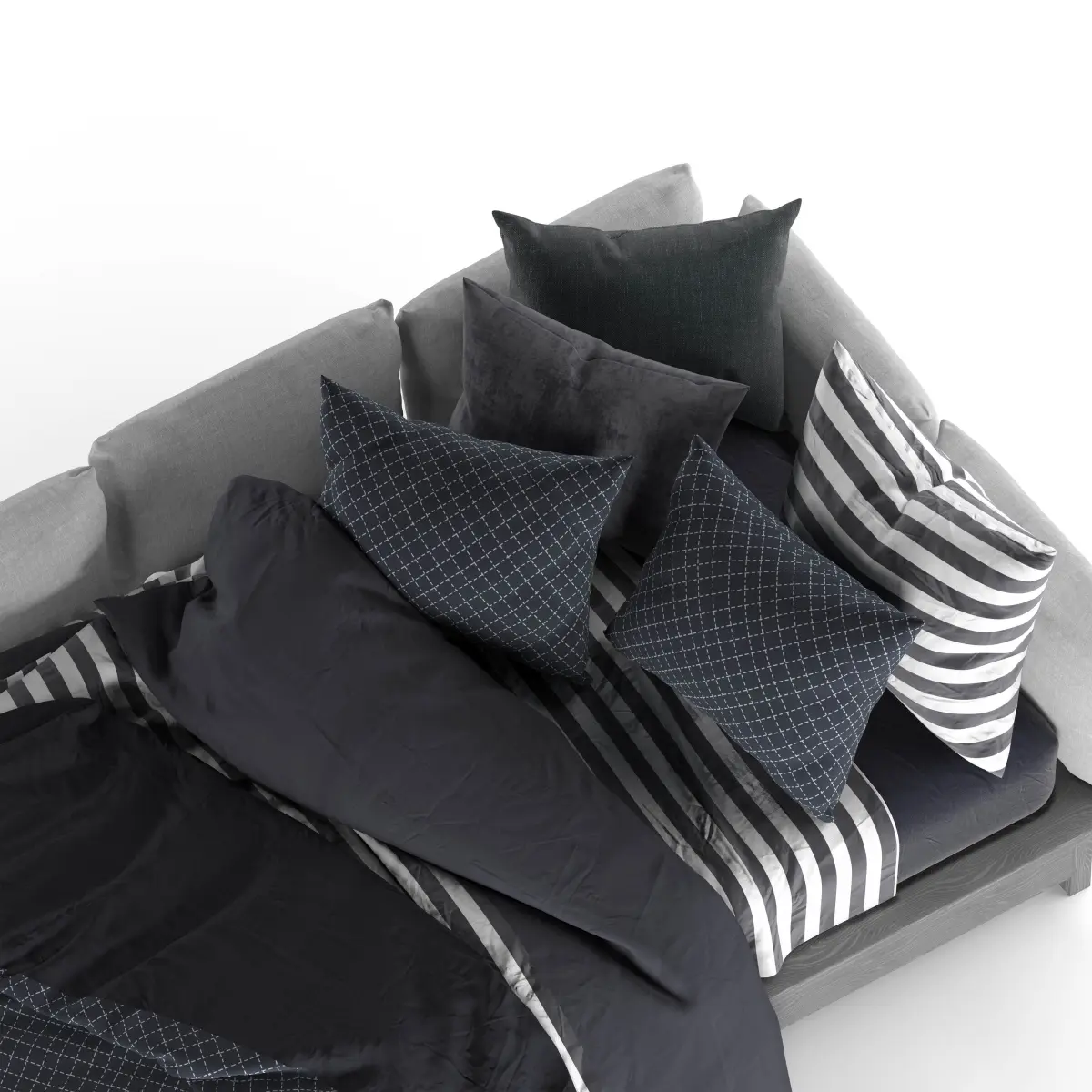 The corner bed set includes a double blanket bed and 5 pillows, a mattress and a sheet. This model is stored in 3ds max 2016 Corona. In the archive of max, obj, mtl and text files. For a more beautiful result in the visualization, please apply the turbosmooth modifier on all textile objects.It includes 257233 Polygons and 258744 Vertices.