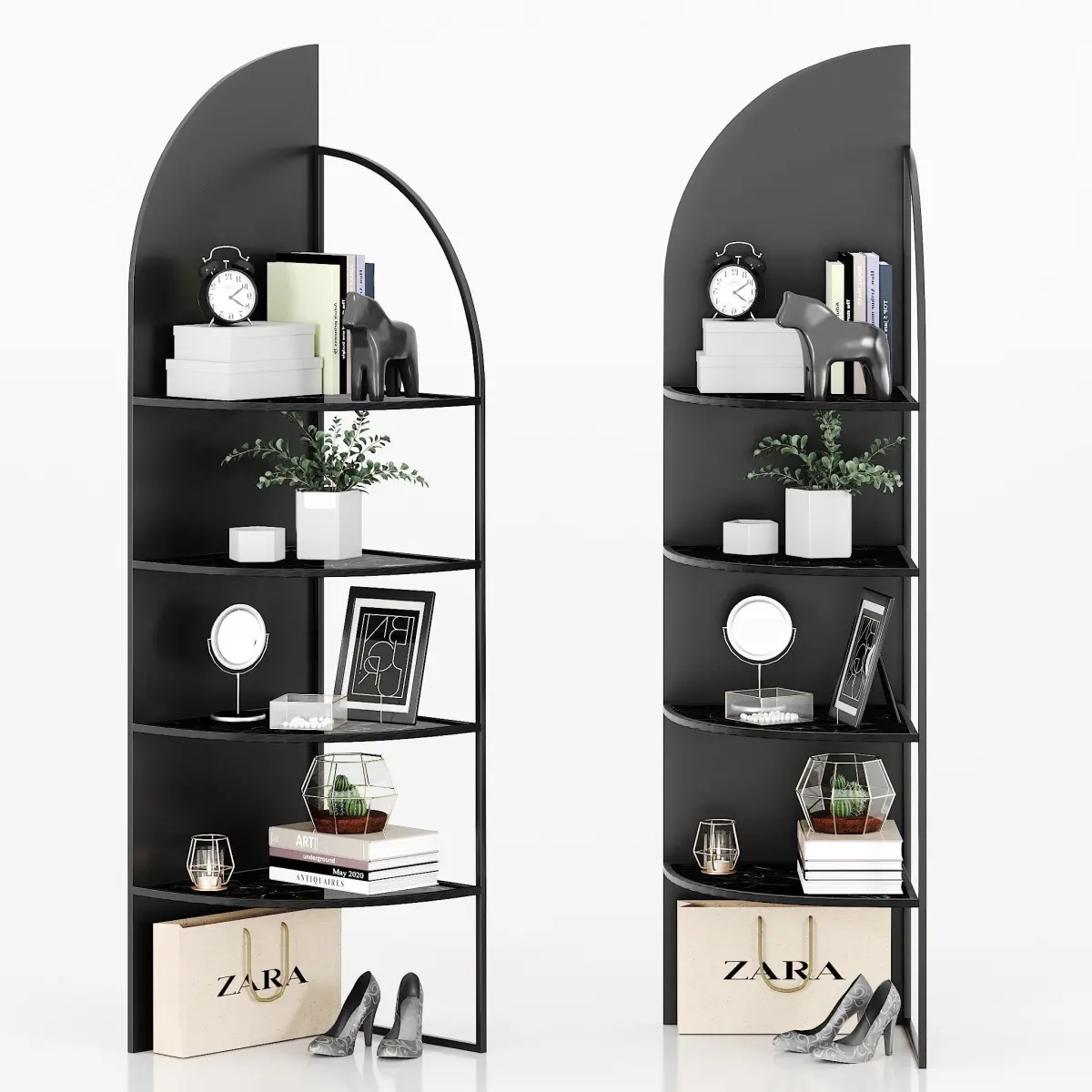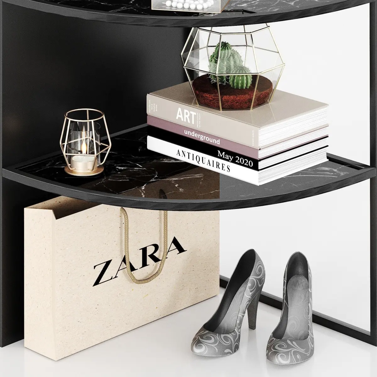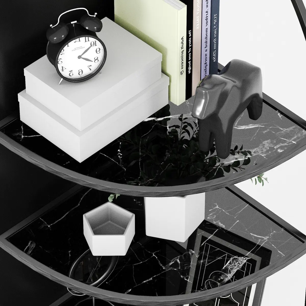 - Corner shelf made of metal and glass, PalazzoAn incredibly beautiful corner shelf made of metal and glass, which, in addition to its practical function, is a very fashionable minimalist decor. Black metal frame with black marbled glass shelves. Playing with the corners, it offers a trendy contrast to an exquisite frame and an airy graphic effect.