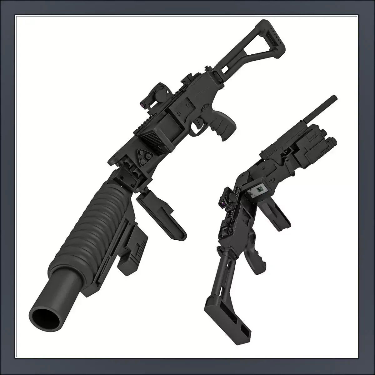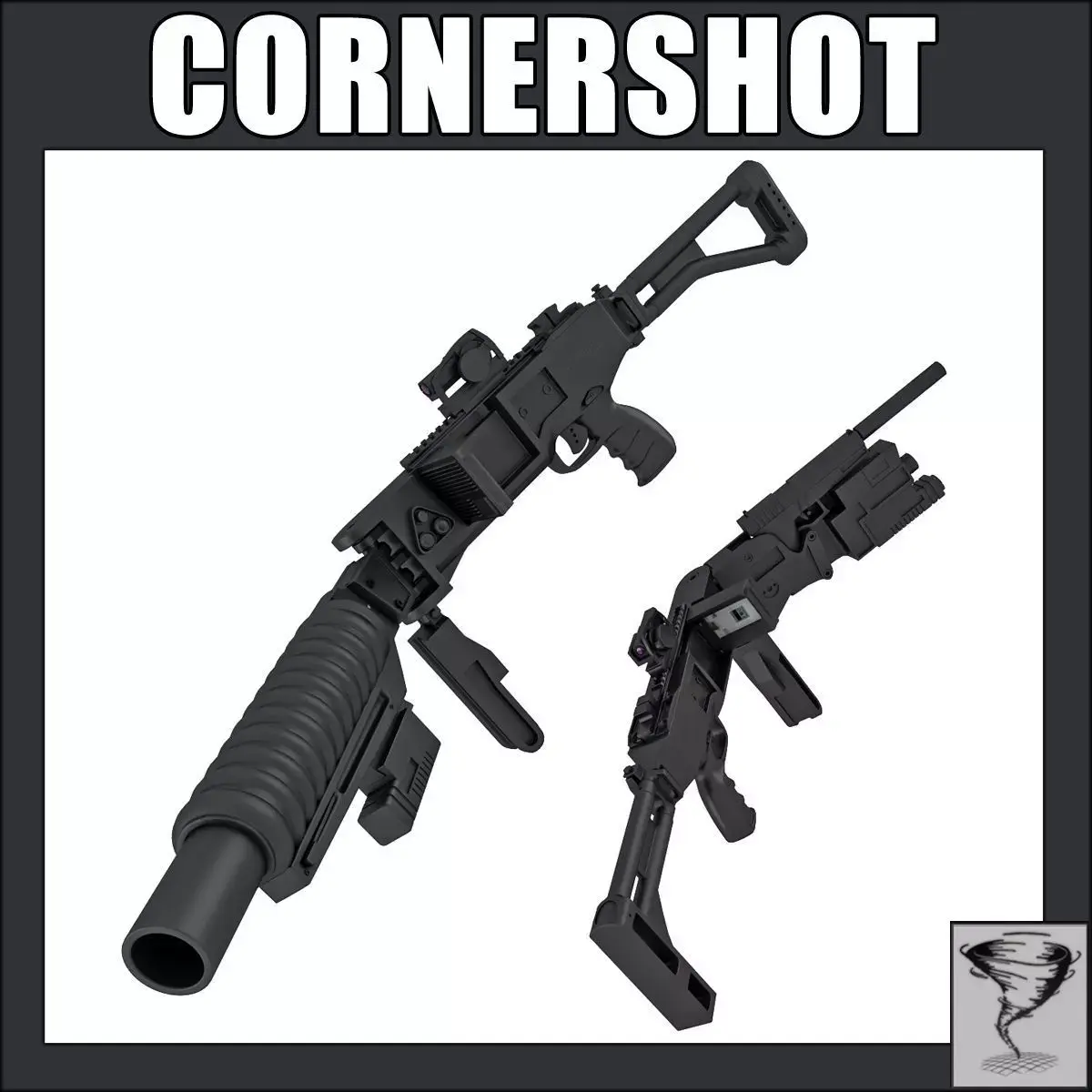 A model of a Corner Shot gun. Comes in two versions - with a pistol and as a grenade launcher. Previews rendered with Vray. Standard materials included (no need for plug-ins) rendered with Mental Ray. Also a Vray version included with Vray materials and scene setup. The model is perfect for close and middle exposure in scenes.