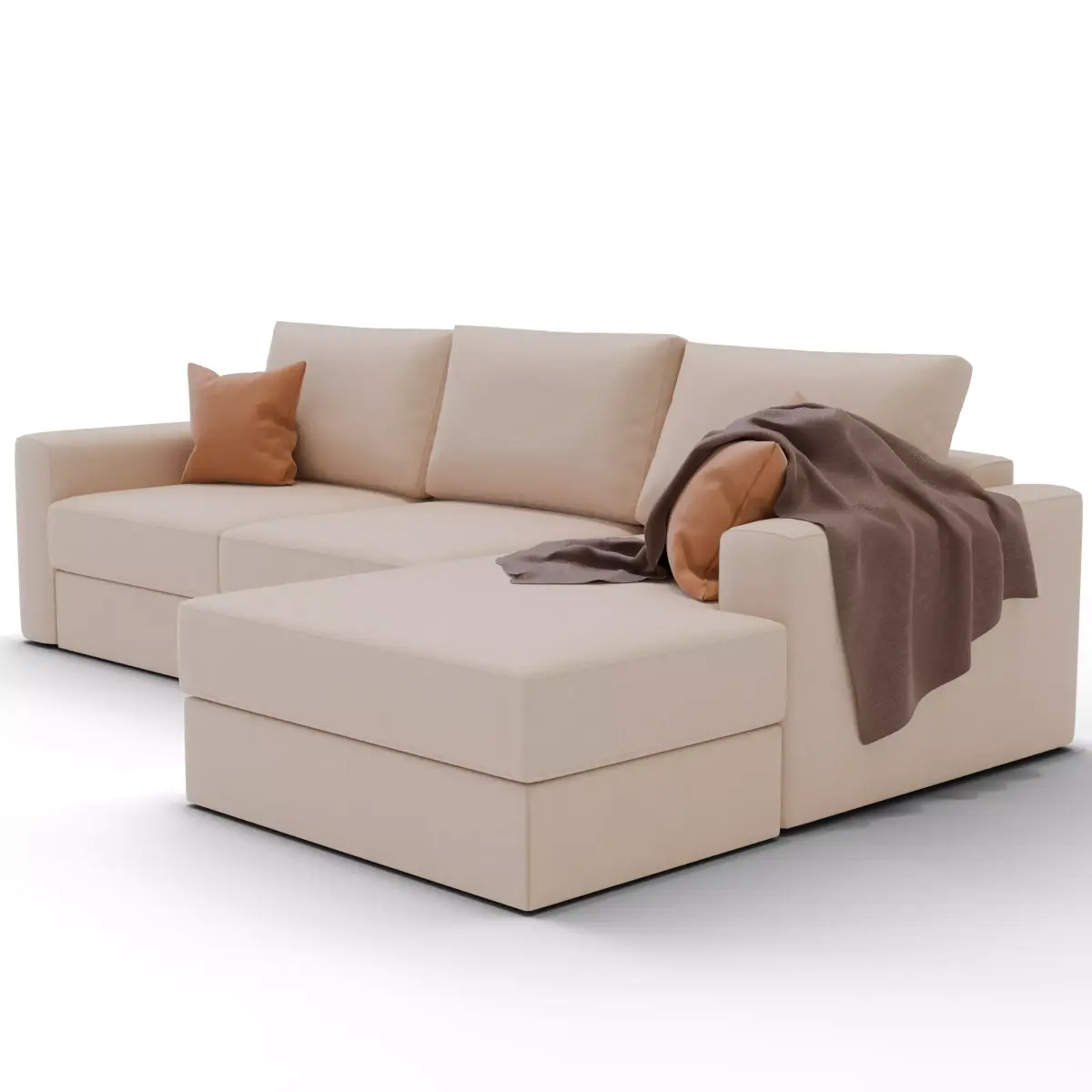 This is a high-quality 3D model of a modern corner sofa, designed for interior render scenes and close-up visualizations. The model features a light beige color scheme with soft fabric material, complemented by pillows and a throw blanket for added realism. All measurements are in centimeters, and the model is centered in the coordinate system.