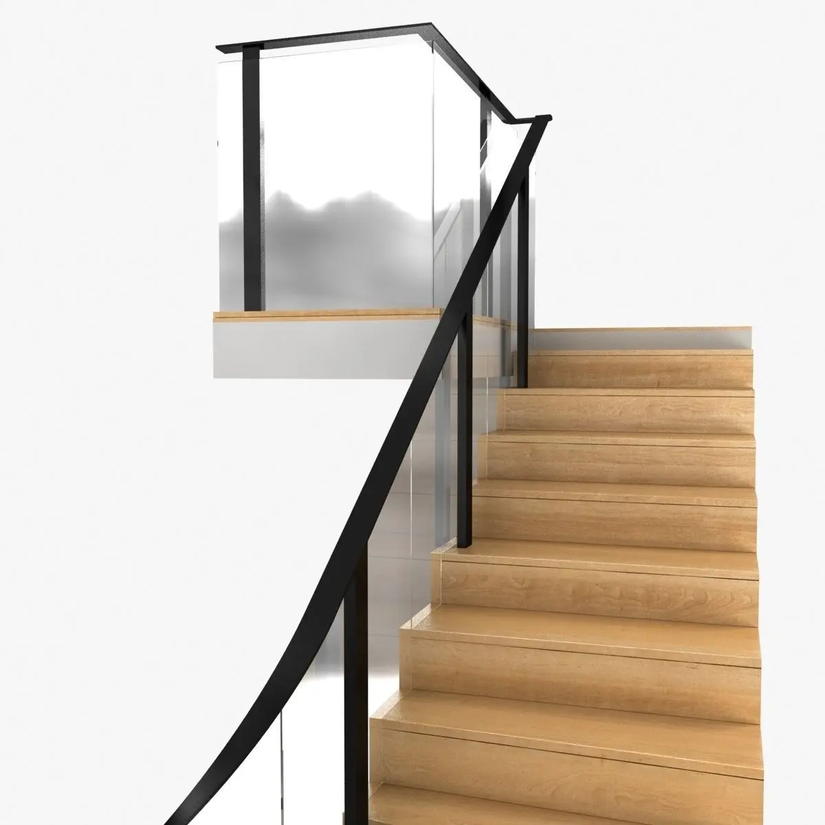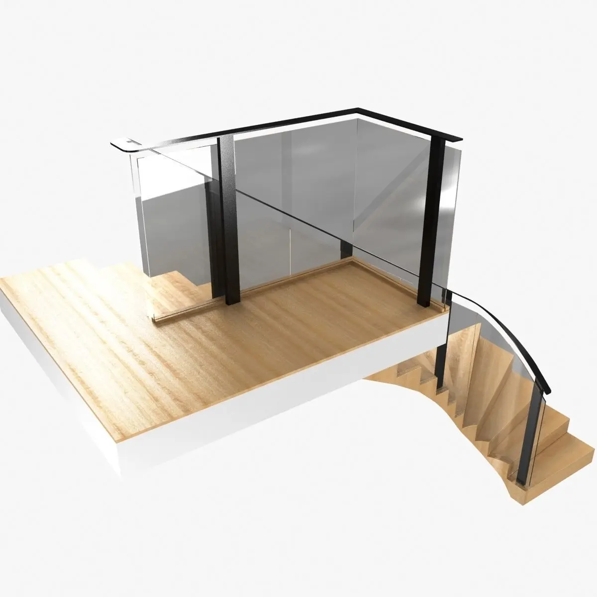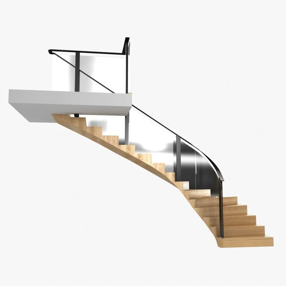 Corner wood interior stairsglass curved guard black painted metal railingwood curved framesolid wood stepsheigh from floor to floor 260cmstep heigh 16cm