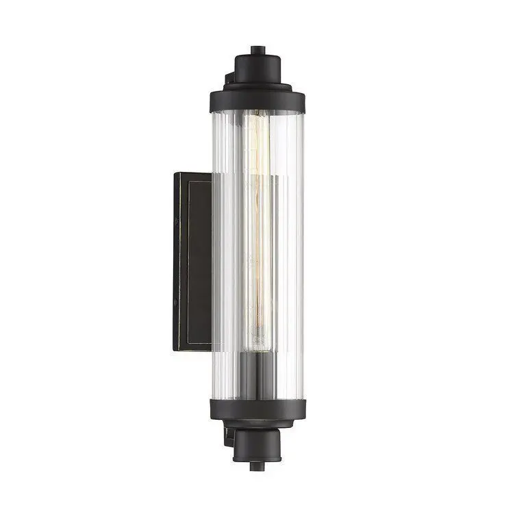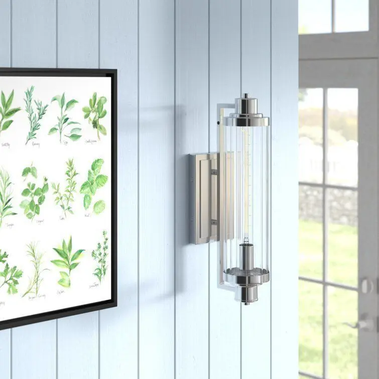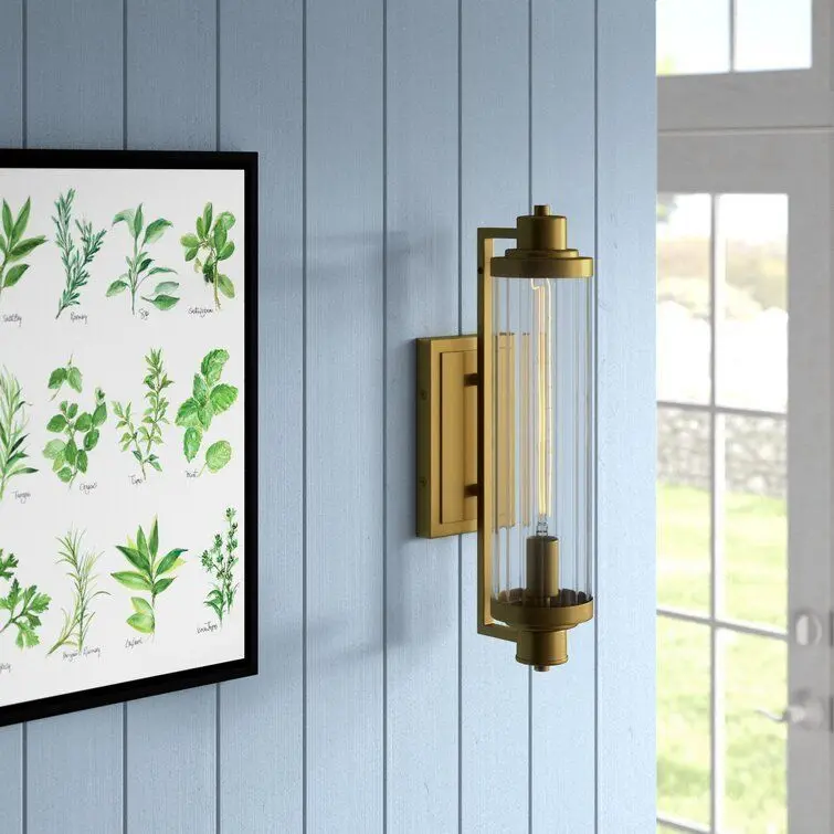 - This wall sconce adds a curated look to your bedroom or entryway with its tube-like silhouette and material contrast. It showcases a ribbed glass shade held to the rectangular backplate by iron arms at both ends. We love how its simple design makes this wall sconce blend with decor styles from coastal cottages to modern industrial.