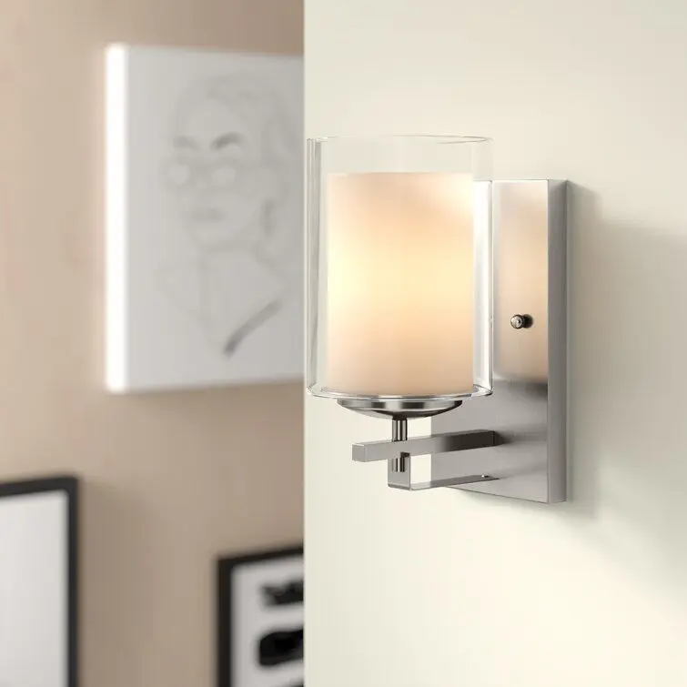 - Brighten your space in curated contemporary style with this one-light wall sconce. Crafted of metal in a fashionable finish, this fixture features a sleek, rectangular backplate complete with decorative screw caps and a short, straight arm.