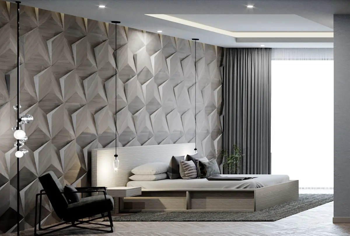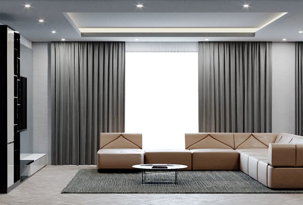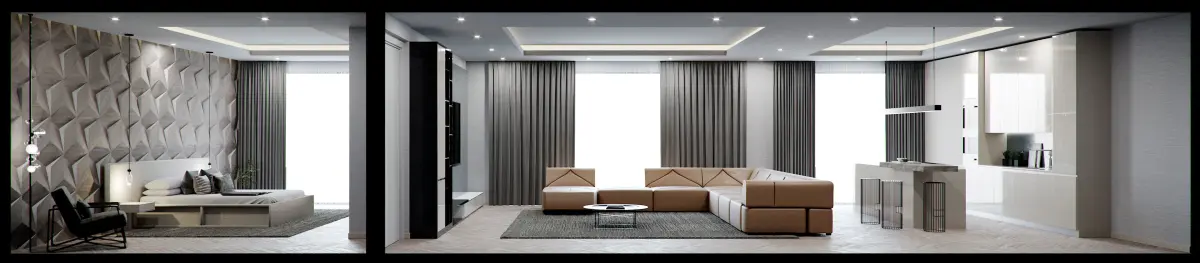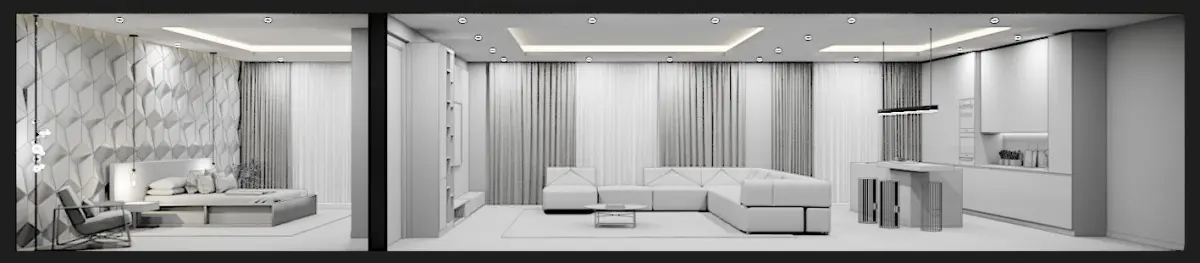 Corona C4D Scene files - Modern Minimalist Home Scene 3D model with a Bedroom, Living room & Kitchen area. (Interior CGI)