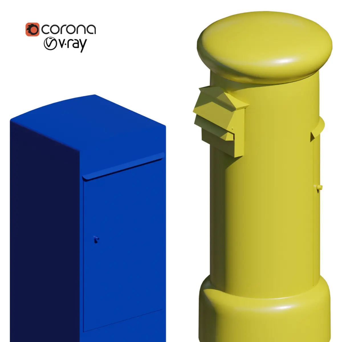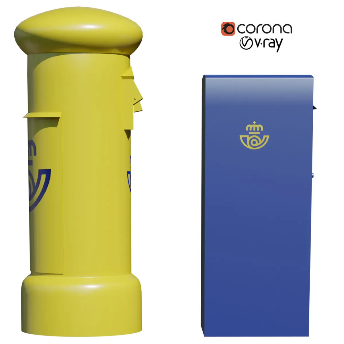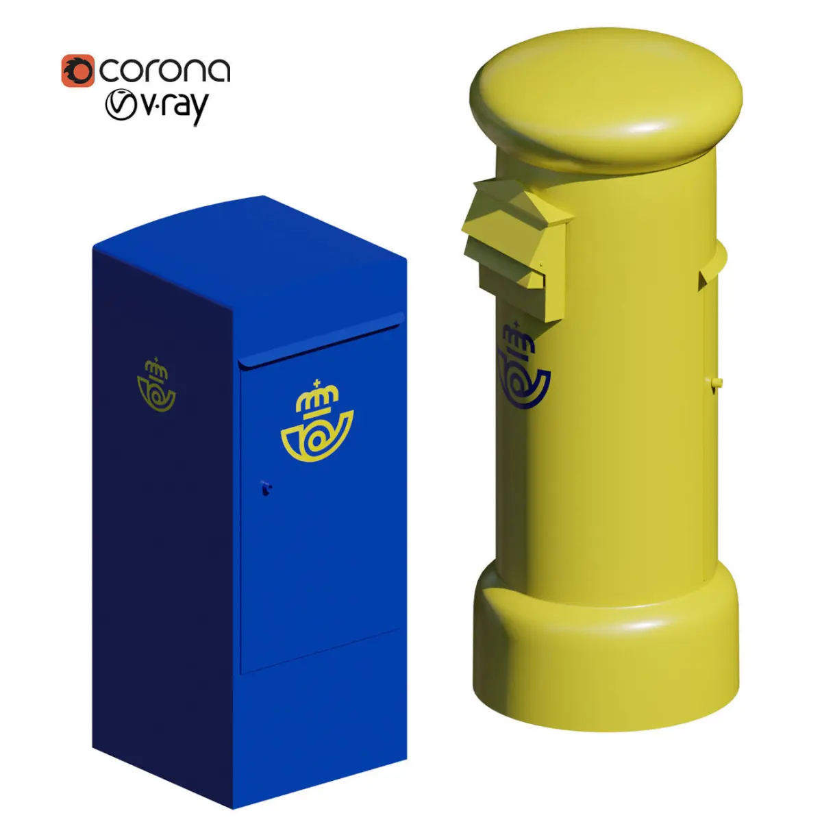 Postal bins of the Spanish company Correos.Dimensions: Yellow R 300mm H 1530 mmBlue W 500mm H 1200mmThere is a card with a logo and without.