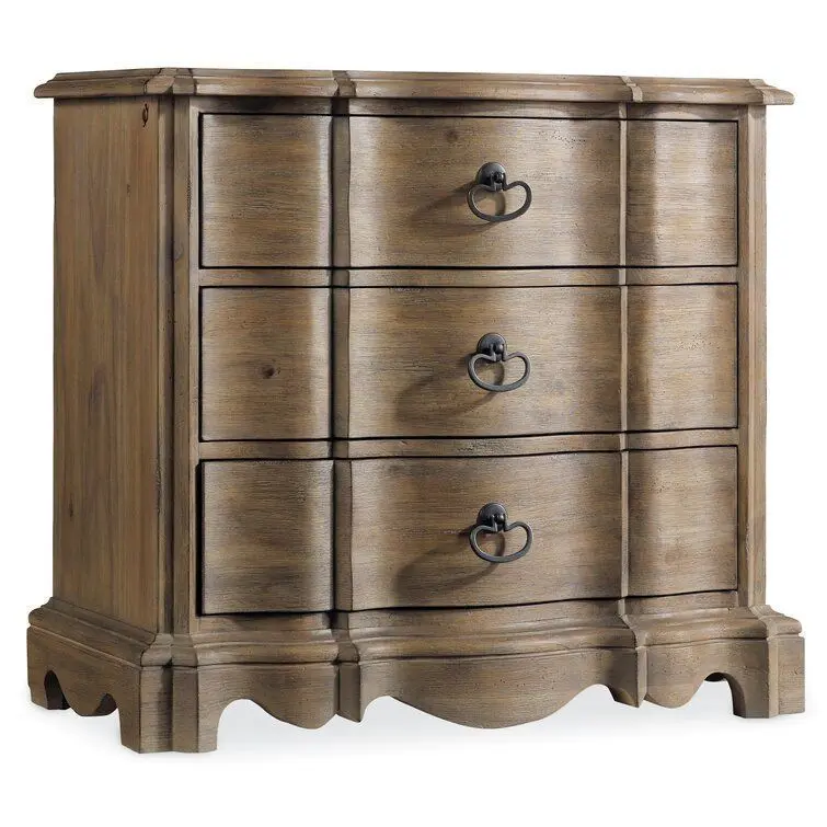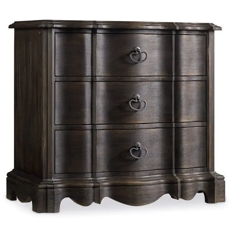 - Graceful architectural elements of Italian, French, and Belgian origin come together on the shaped silhouette of the Corsica 3-drawer nightstand with a scalloped base and ring-shaped burnished bronze hardware. The timeless nightstand is made casual by the wire-brushed, artisan espresso finish with a reclaimed character on exotic beautiful Acacia wood, known for its tactile hand, knots, and organic colour variations. The top drawer is felt-lined, and the bottom drawer is cedar-lined. A touch light that illuminates from the bottom of the nightstand offers ambiance.