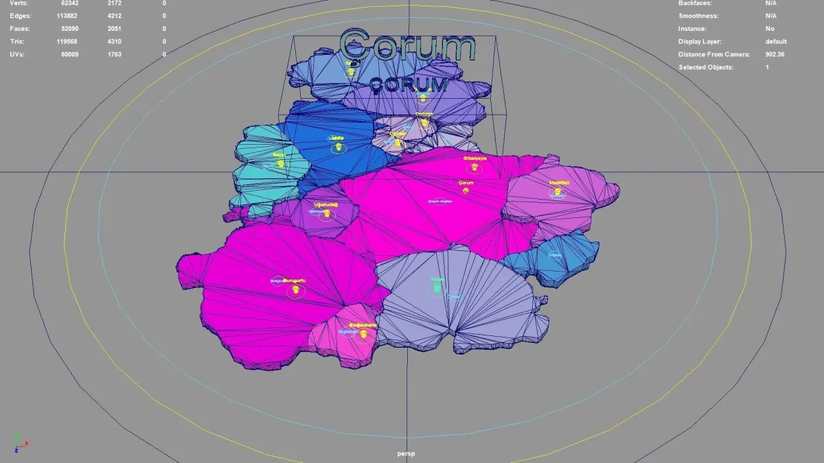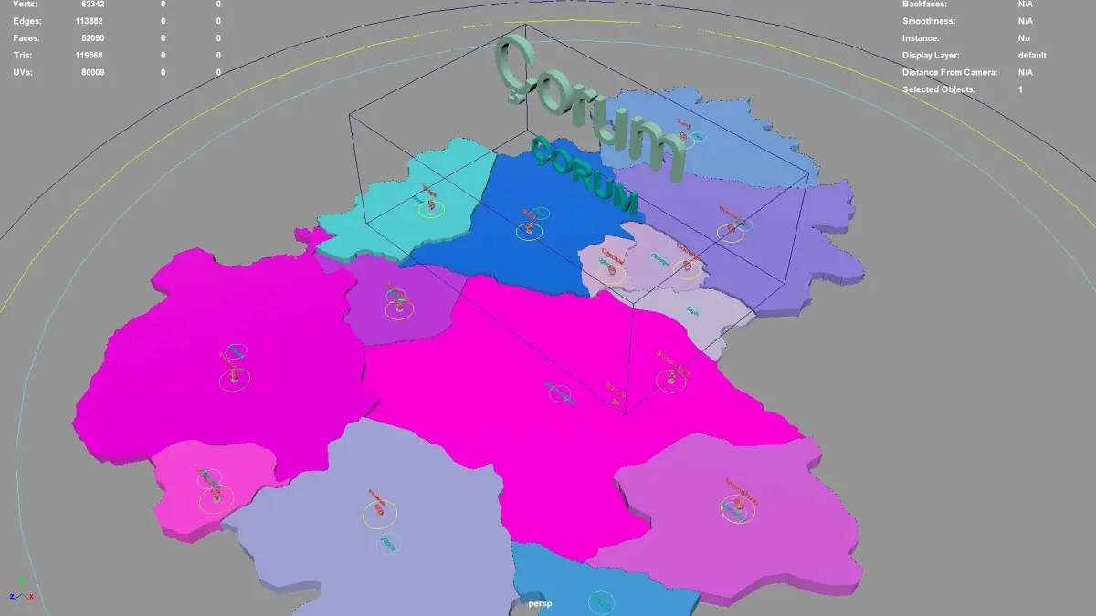 Çorum regions : The model is divided according to the administrative region of Çorum. Each region is clearly separated so you can easily isolate it or change the colors. Names are also editable and separate.
